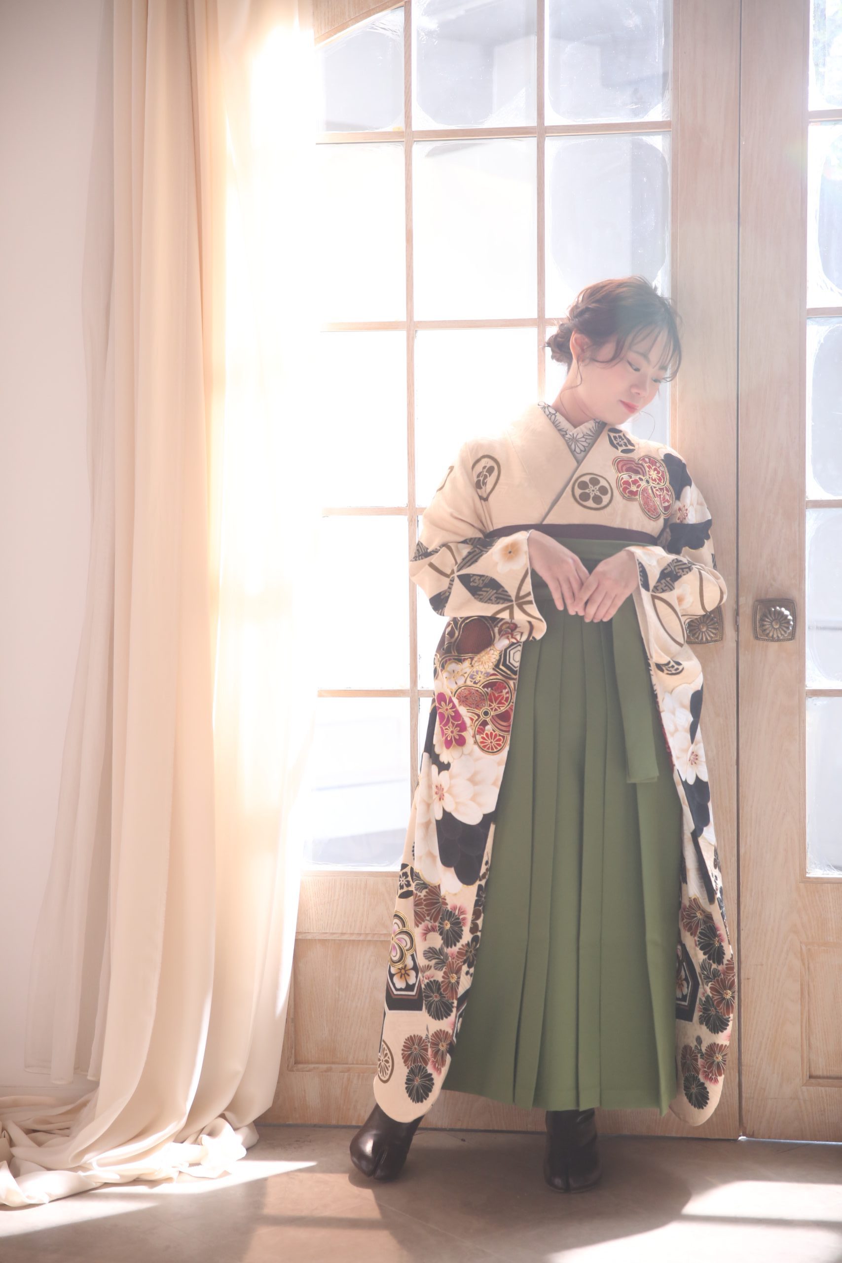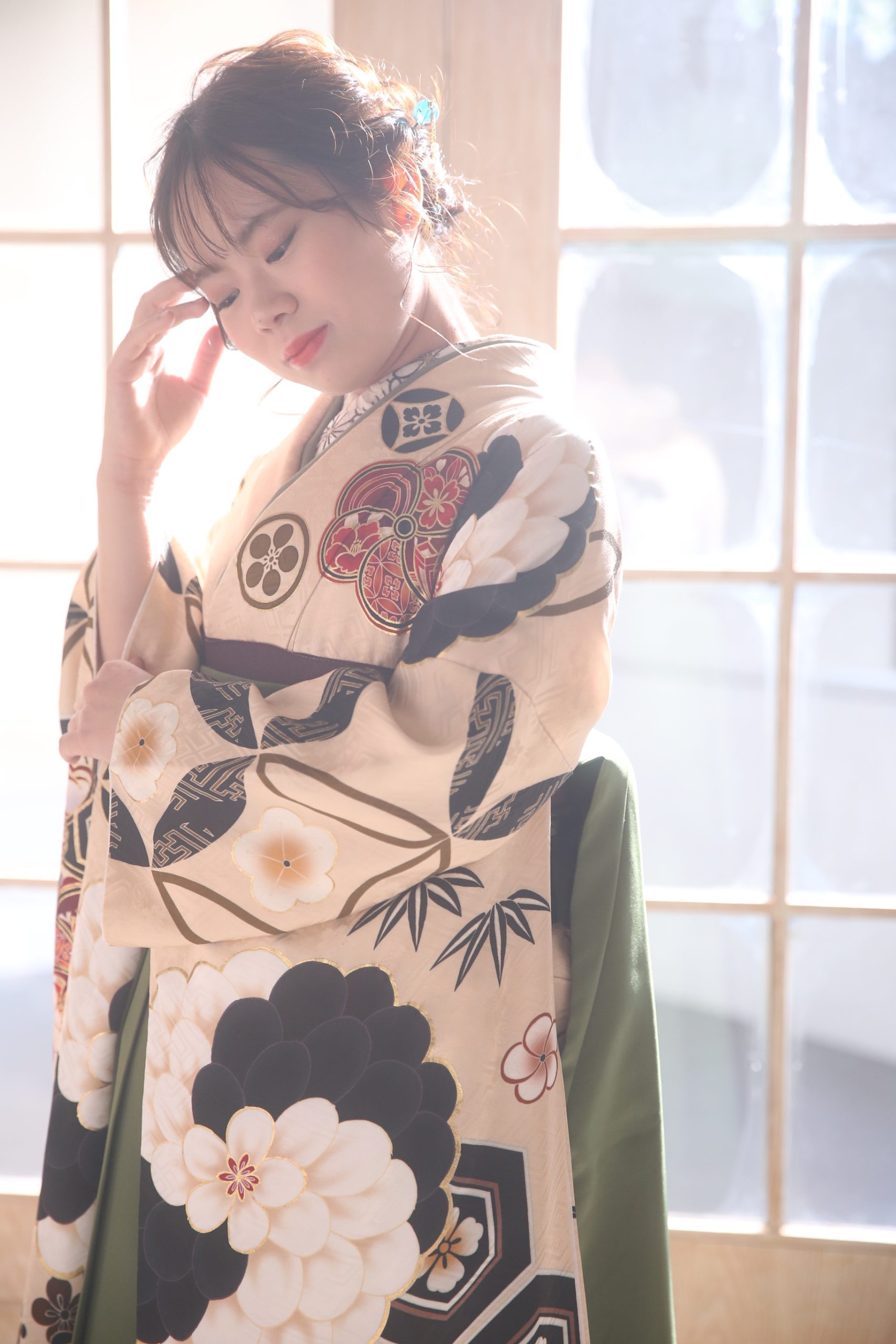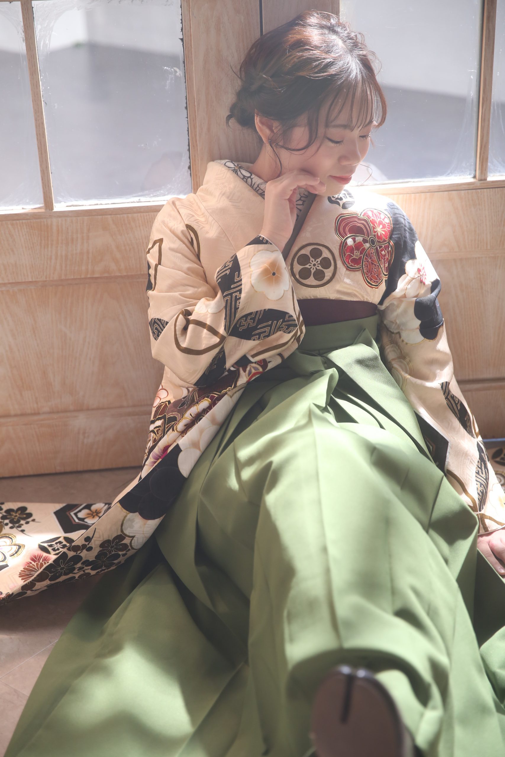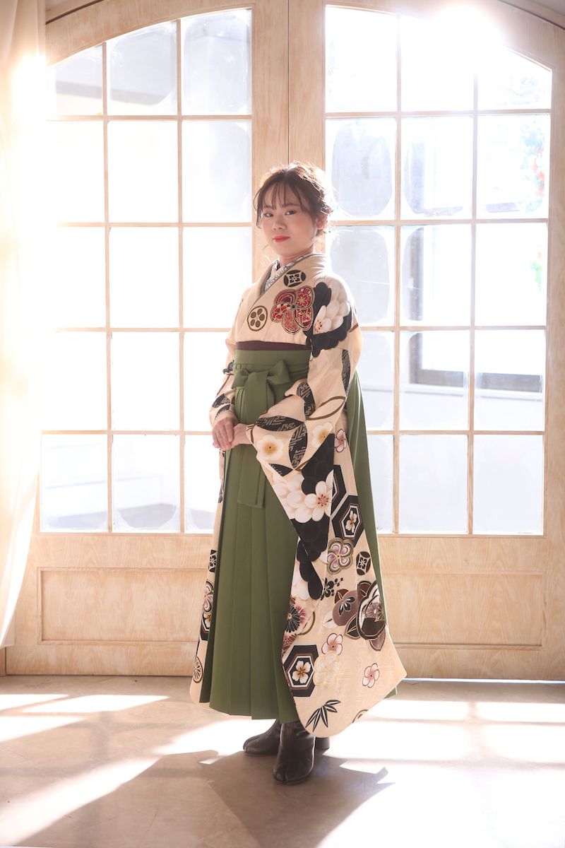ベージュのお振袖に合わせたライトグリーンの袴が、レトロモダンな印象でご着用いただけます。