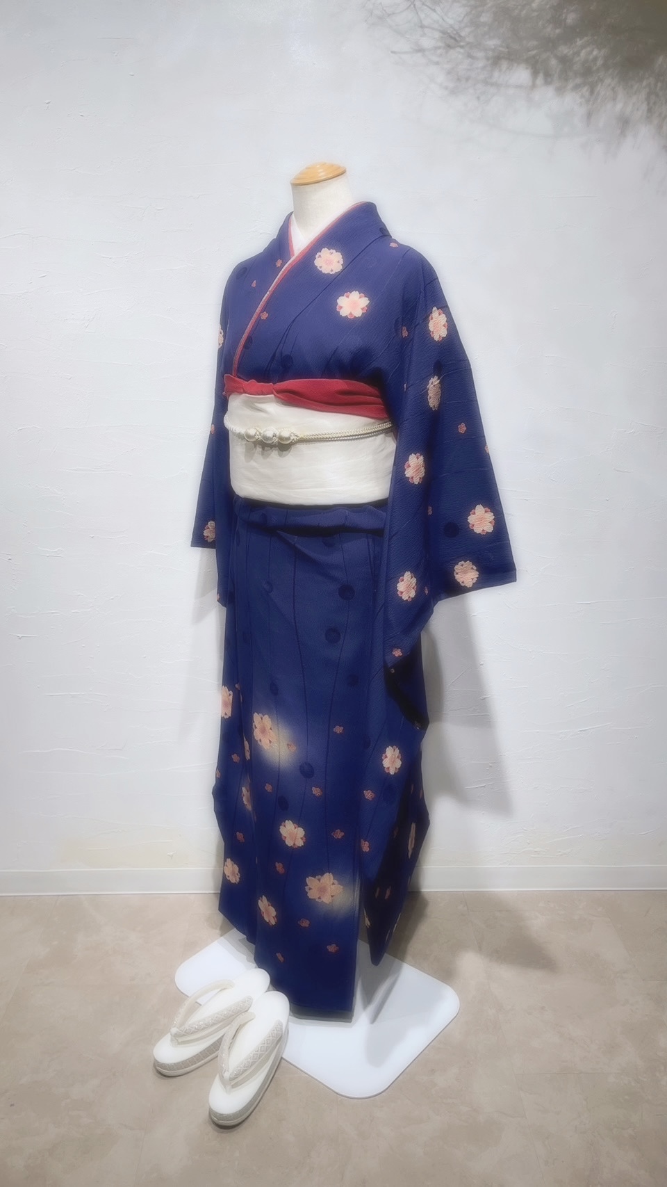 落ち着いたネイビーカラーに美しい桜のデザインが施された1着。