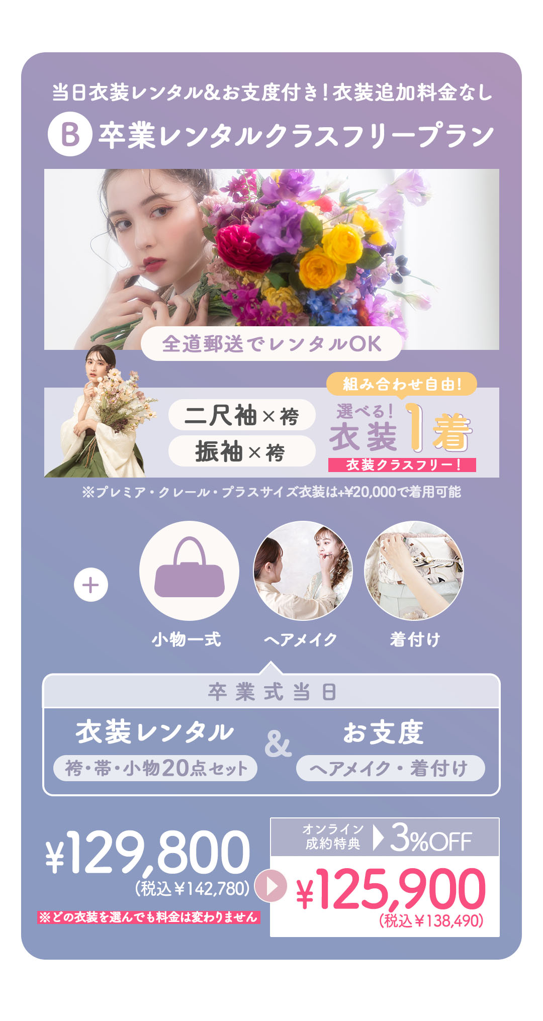 ・選んだ袴によって金額が変動しないクラスフリープランです。