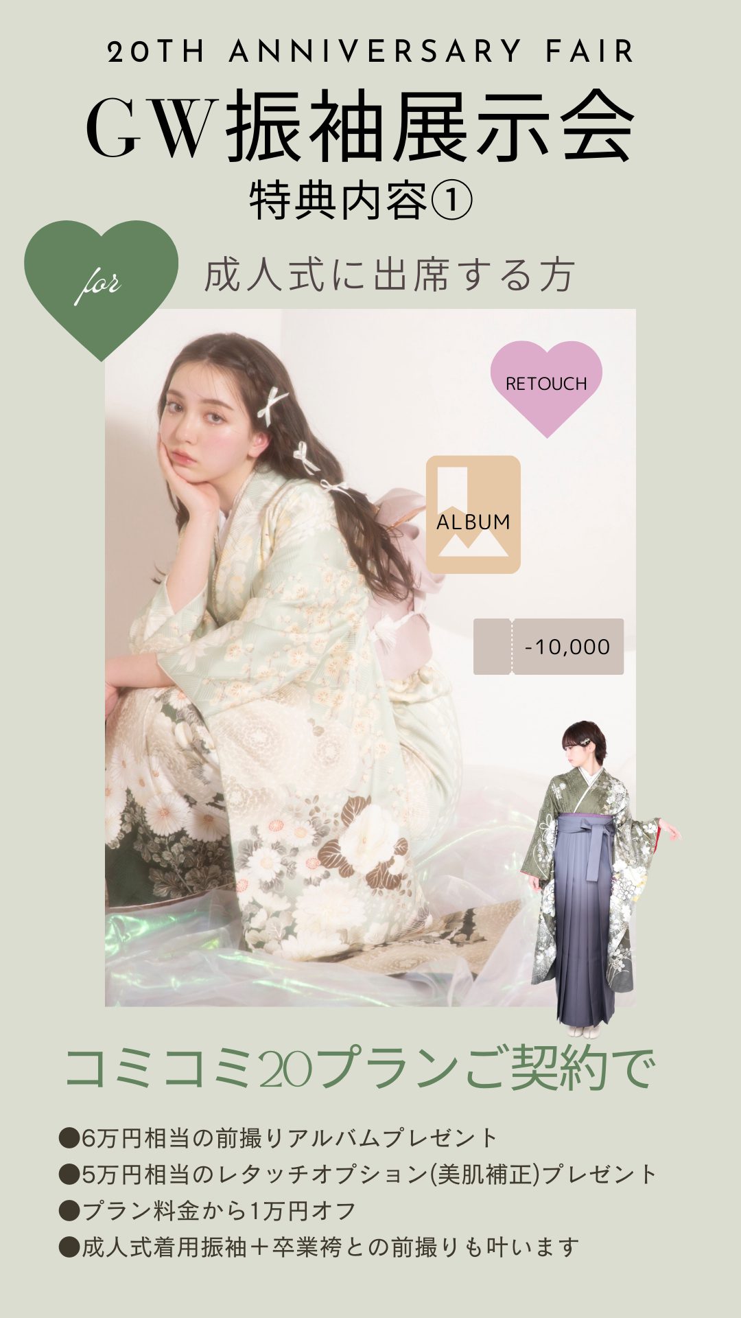 成人式の振袖を当店でレンタル&撮影を行う方にぴったりなコミコミ20プラン。
