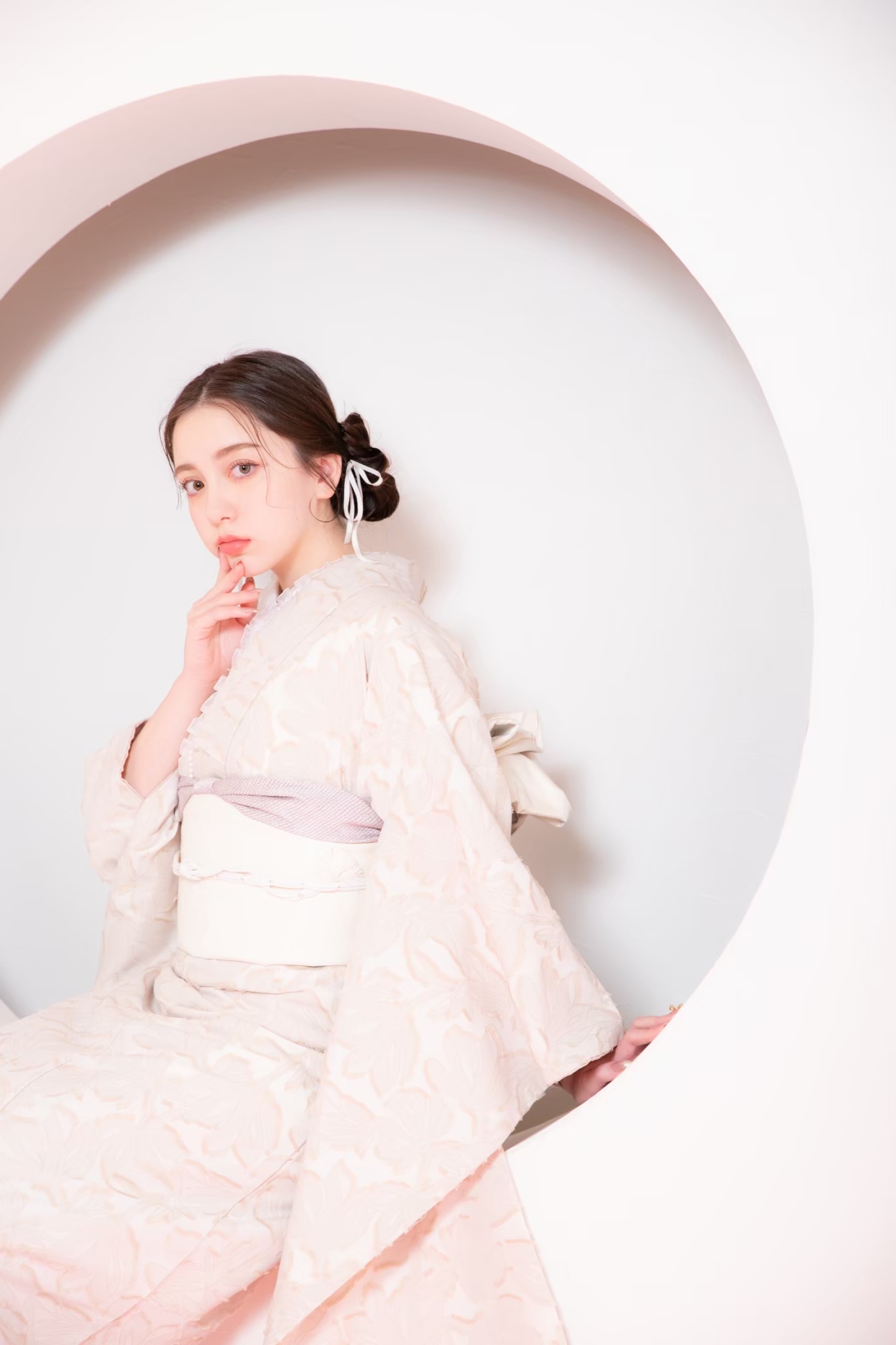 淡く可愛い振袖に、フリル襟を合わせたコーディネート
