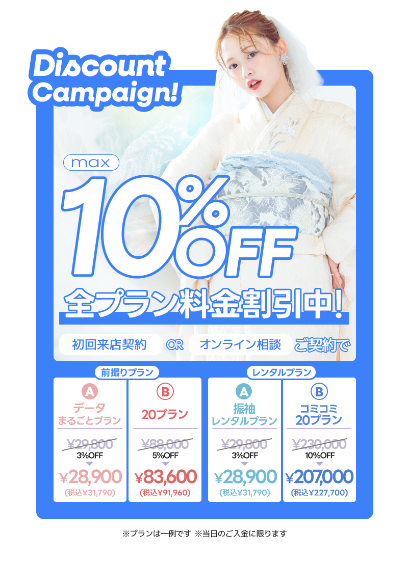 当店1番人気の成人式当日レンタル・お支度・前撮り付き”コミコミ20プラン”をご契約の方に最大12万円相当分をプレゼント!