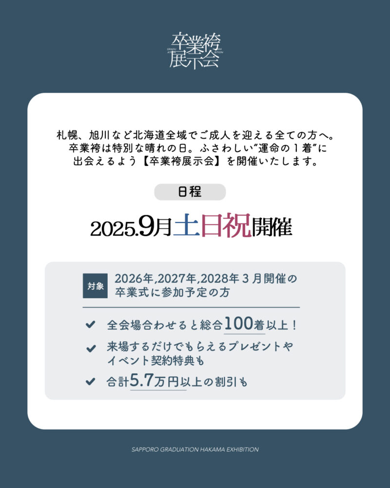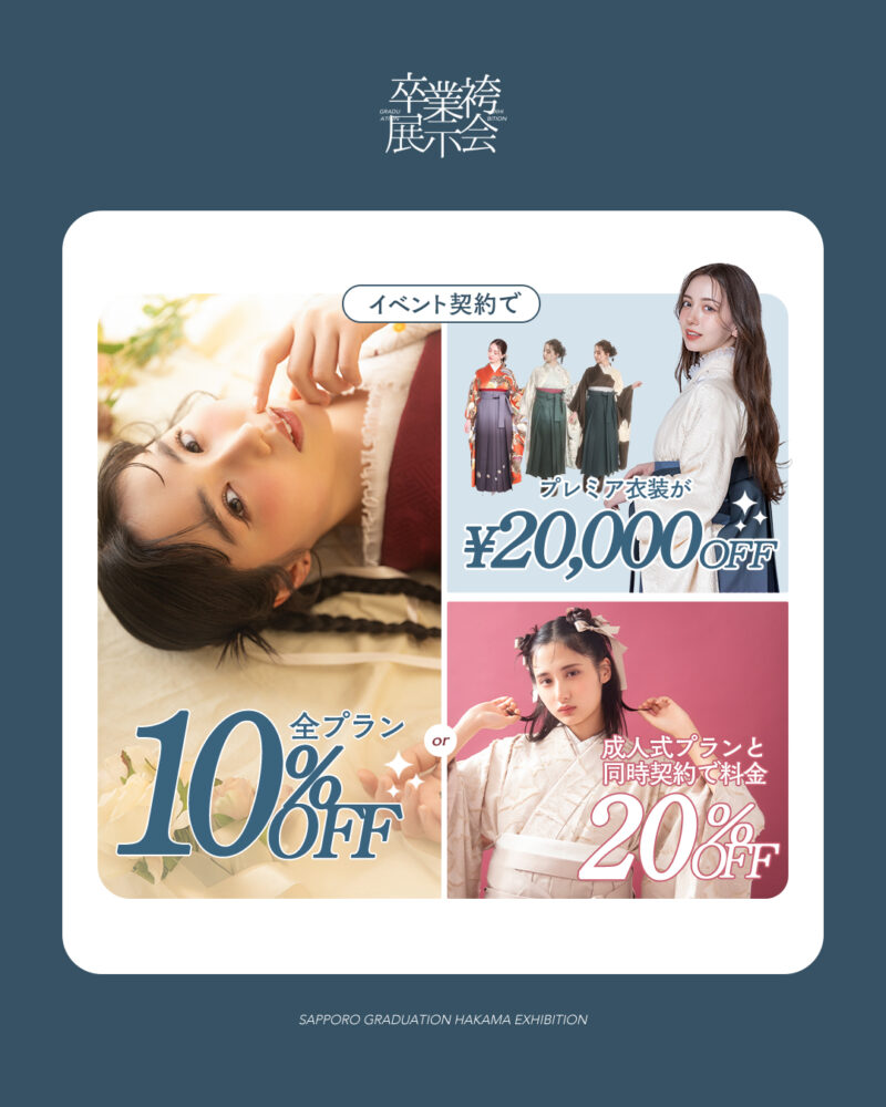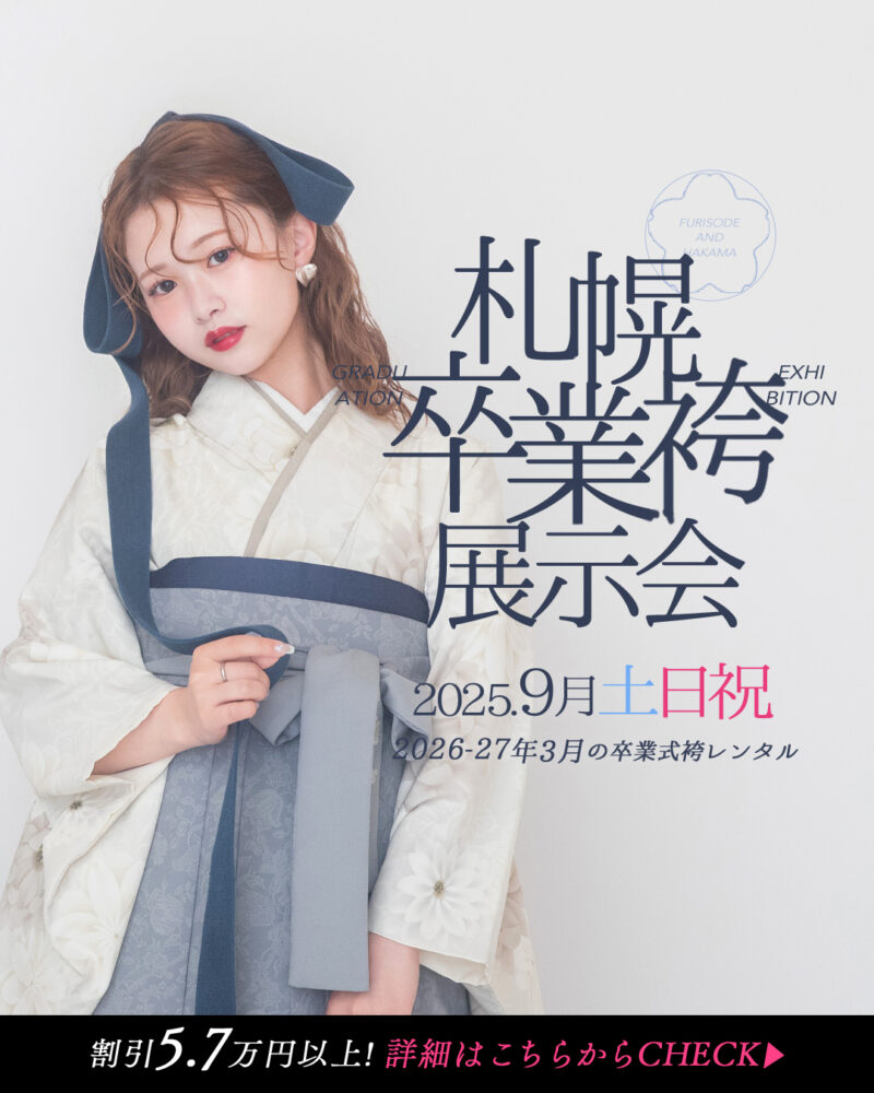 北海道札幌市中央区にある振袖レンタルショップ 写真工房ぱれっと札幌中央店では毎週末卒業袴展示会を開催中! 9月ラスト、お得すぎるこの機会をお見逃しなく!