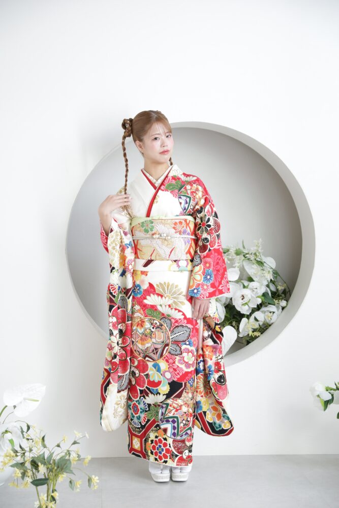 スタジオもお着物のカラーが映えるシンプルな白貴重でスタイリッシュな背景へ。