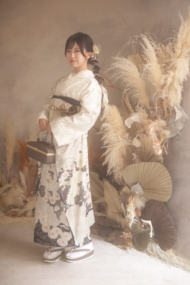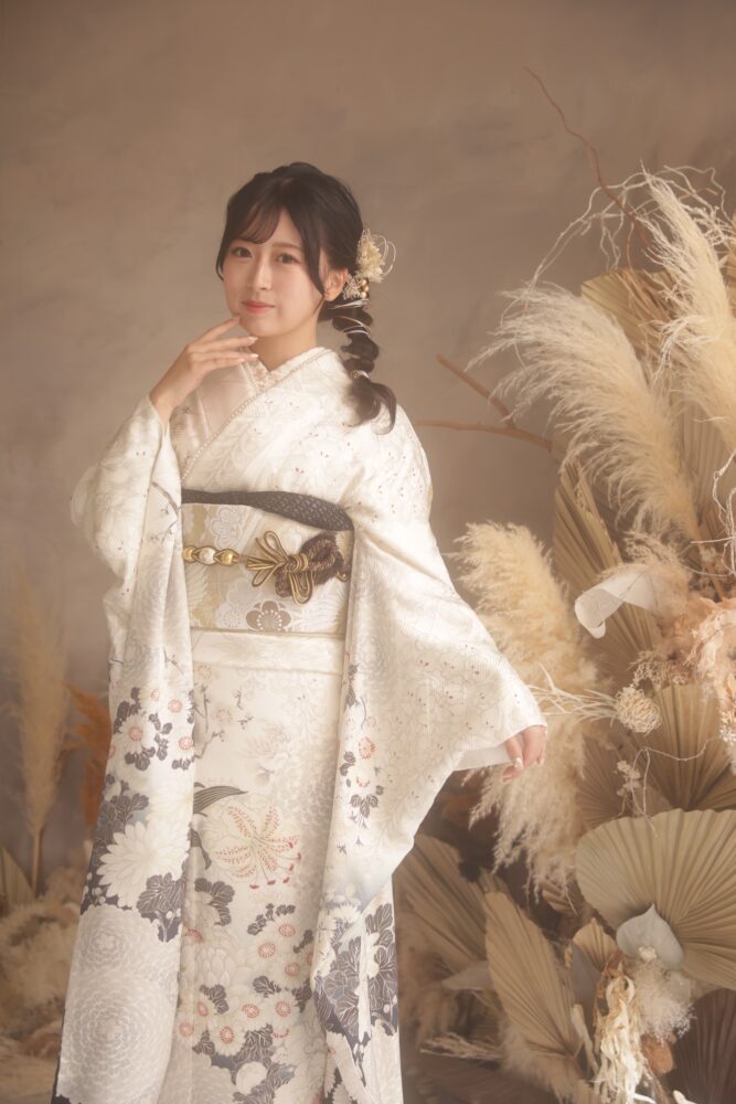 振袖の美しさを活かしつつ、帯や小物はくすみカラー、淡いトーンで合わせて、洗練された雰囲気に♪