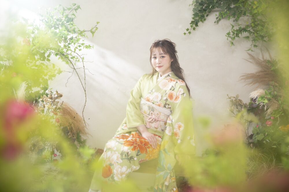 ライムグリーンの振袖の色合いと相まって、より若々しく清らかな印象を与えています。
