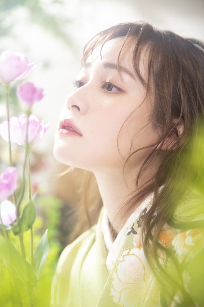 古典的な着物姿でありながら、アップスタイルではなくあえてダウンスタイルを選ぶことで、