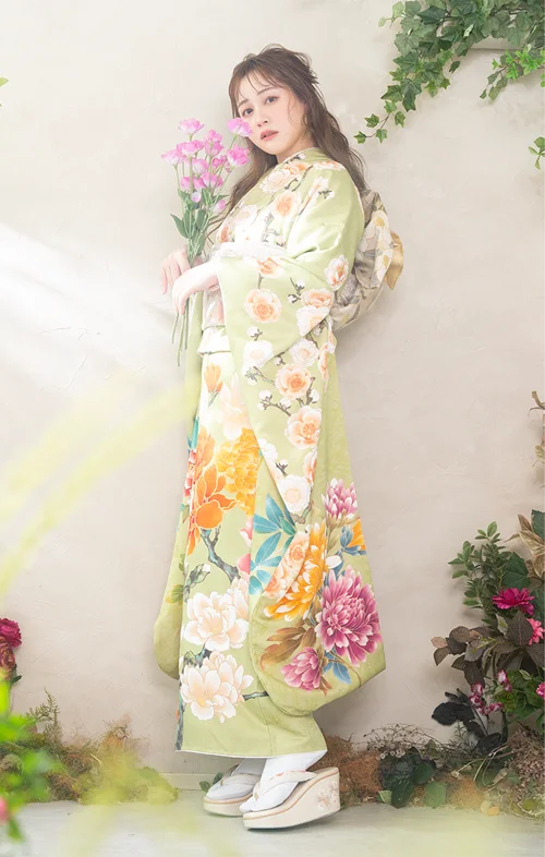 写真の振袖は明るいライムグリーンがベースになっており、これがまず大きな魅力となっています。