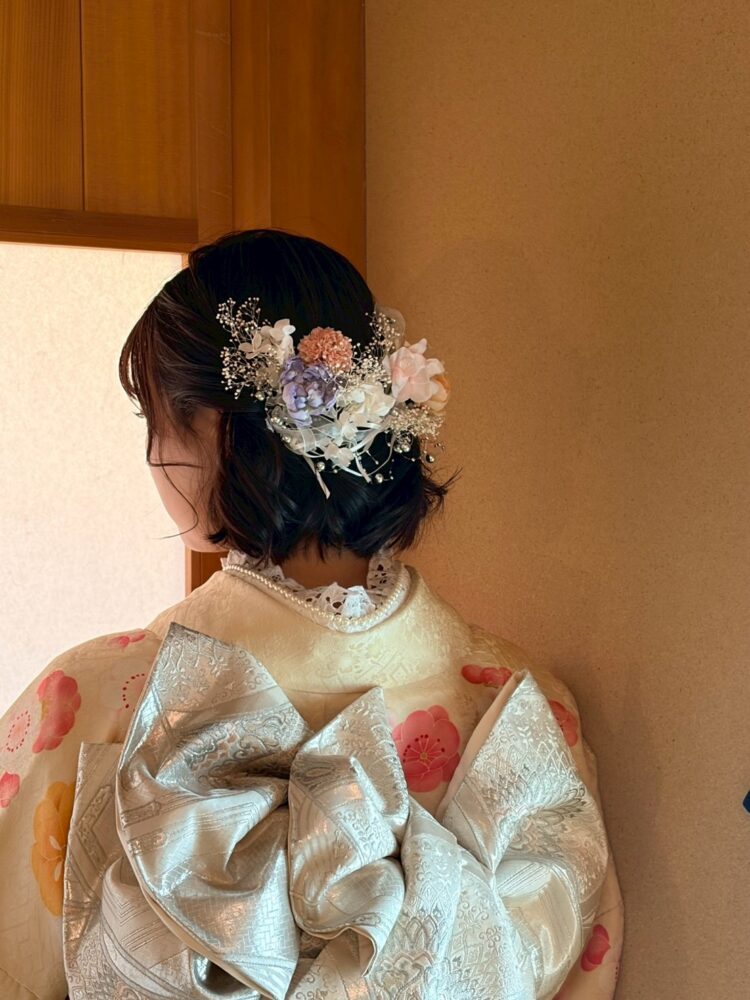 ショートヘアは顔周りがスッキリと見え、振袖の豪華な襟元や帯のデザインを最大限に引き立てることができるスタイルです。
