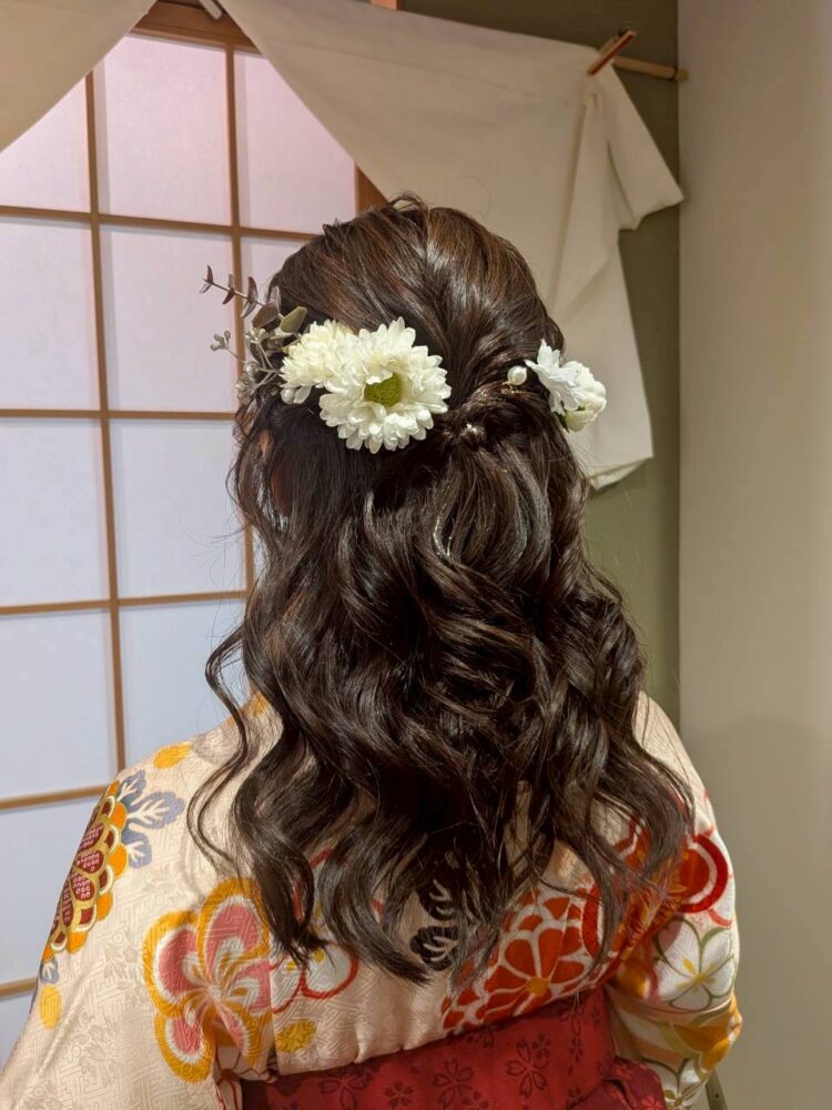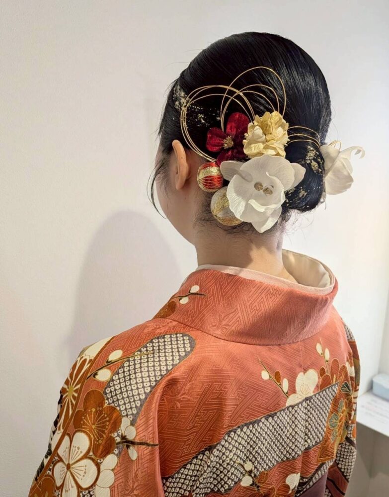 トップにボリュームを持たせ、下ろした髪を外ハネやミックス巻きにすることで、振袖の重厚感に軽やかな可愛さをプラスできます。