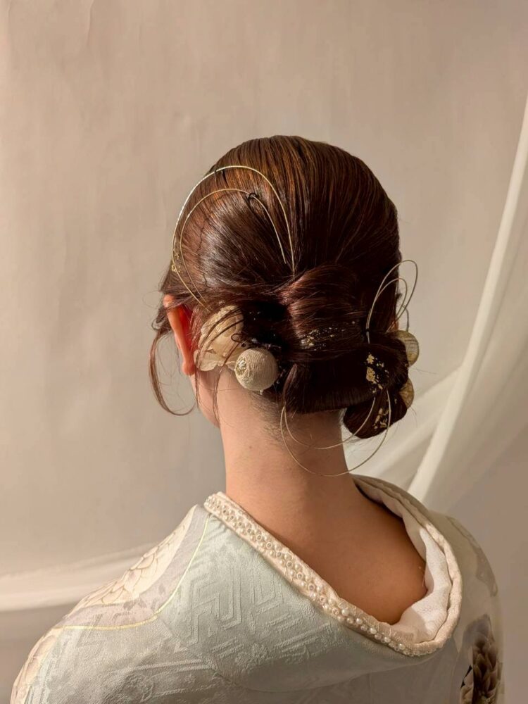 和装では凛としたまとめ髪、ドレスではふわふわのダウンスタイルなど、全く異なる二つの魅力を一日に残すことができます。