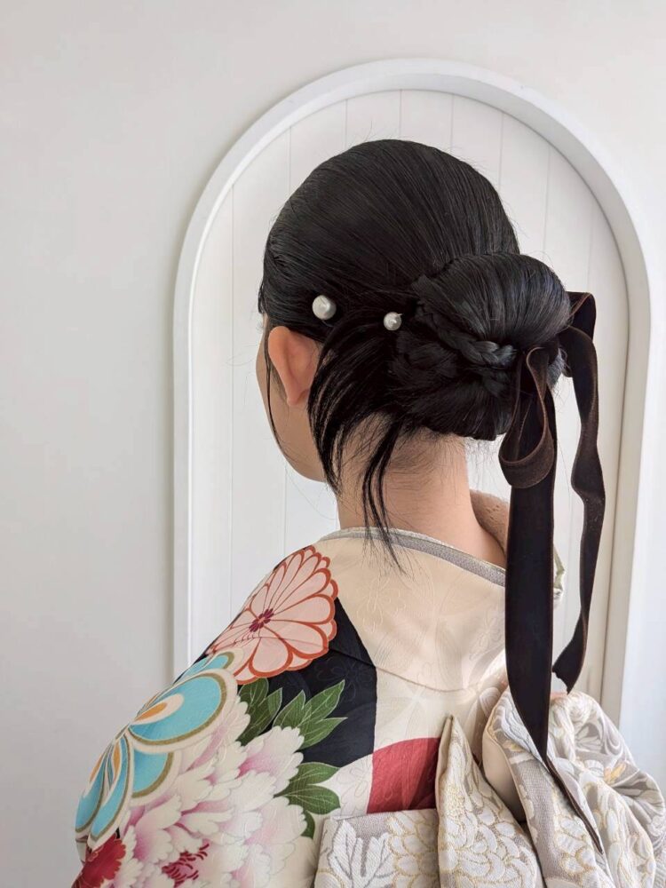 低めの位置でまとめるシニヨンは、成人式の王道でありながら、ミディアムヘアならほどよいボリューム感で上品に仕上がります。