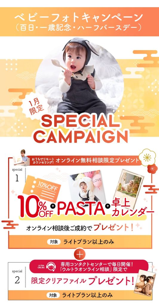 ぱれっとでは、百日・ハーフ・一歳・七五三と