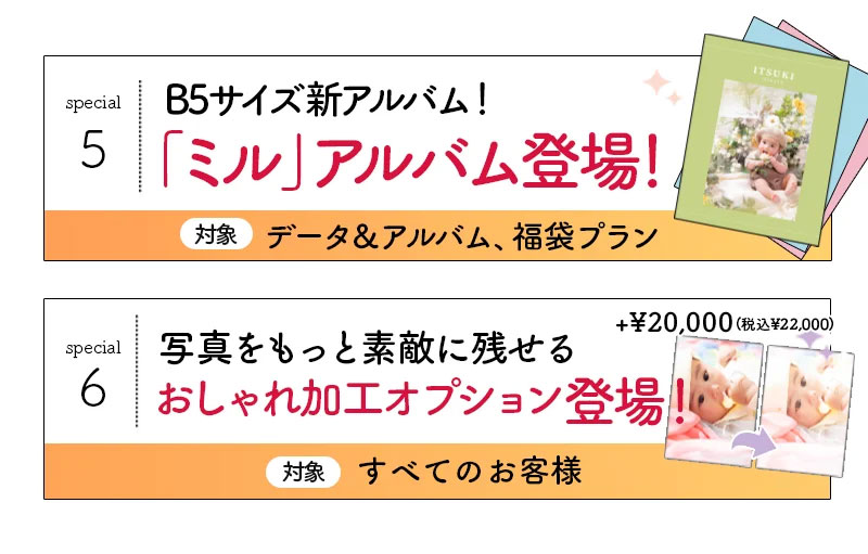 20カットのデザインアルバムなど様々なタイプのアルバムをご用意。