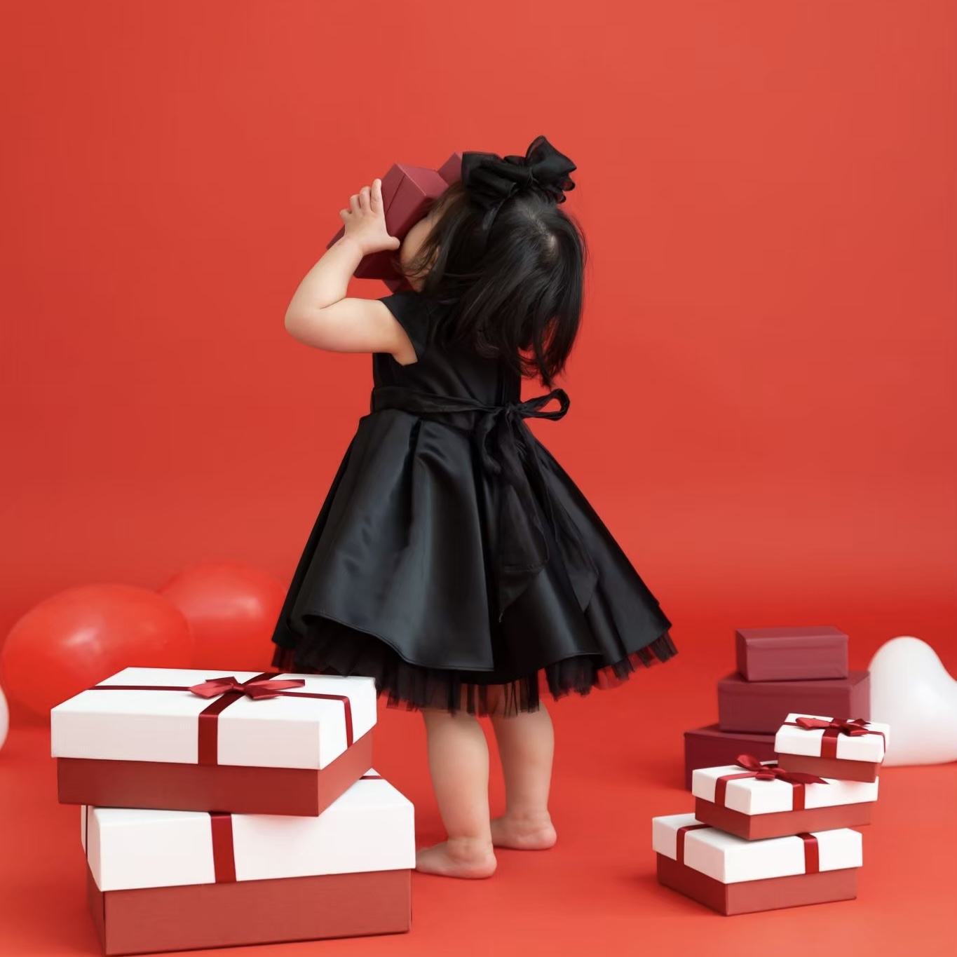 黒のドレスとチョコレートを包む赤のプレゼントボックスが、可愛らしさを引き出してくれる