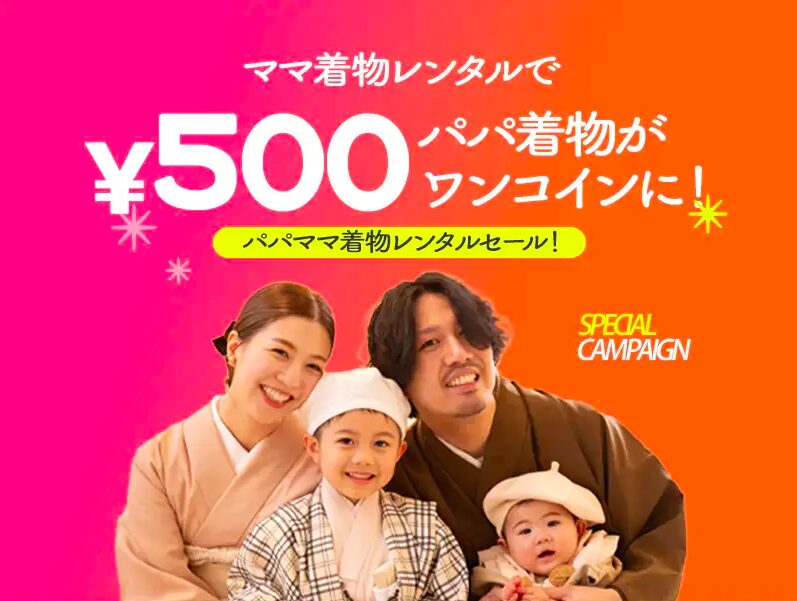 こんにちは! 写真工房ぱれっと旭川店です。 まま着物レンタルでぱぱがワンコインでレンタルできちゃう!!? 今回はぱぱまま着物レンタルのお得な情報をご案内いたします♪ 7月中のご契約限定! ママ着物レンタル33,000円で、 今だけパパ着物がワンコイン500円!!