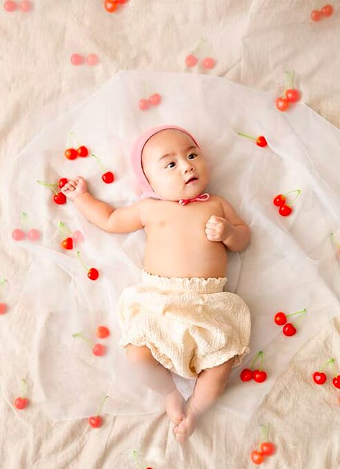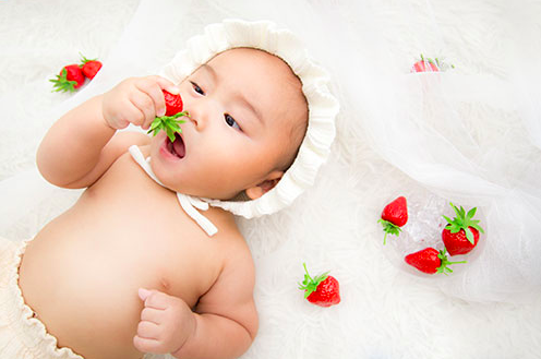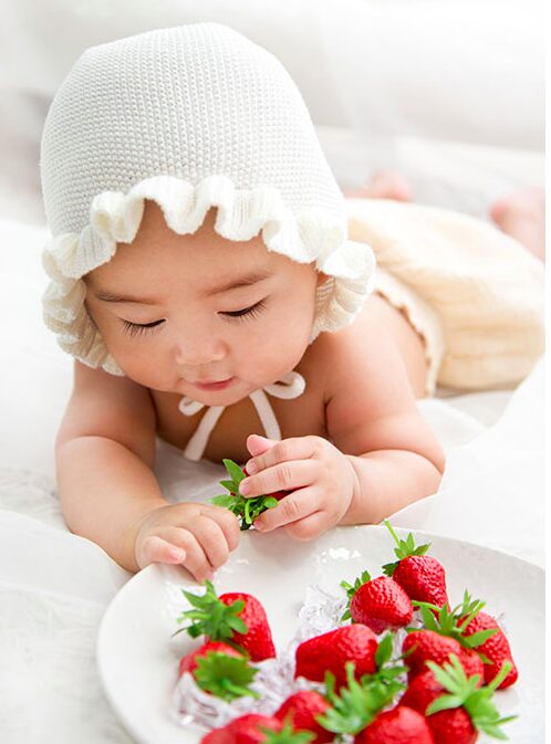赤ちゃんらしさ満点!真っ白なボンネットと真っ赤ないちごの組み合わせが相性バツグン♡