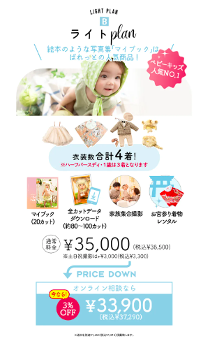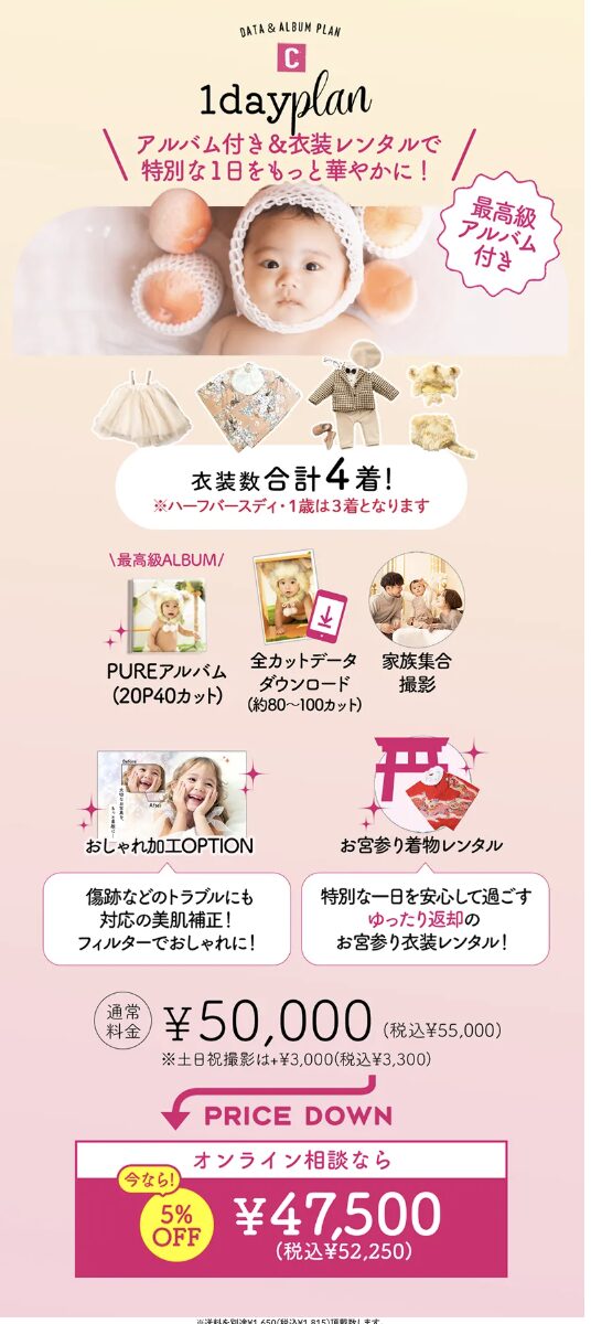 - さらに、美肌補正も可能な「おしゃれ加工option」 や、「お宮参り着物レンタル」 も含まれた充実プランです。