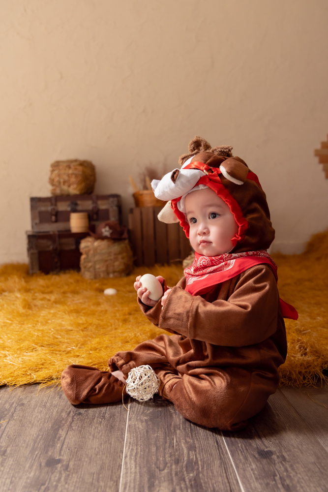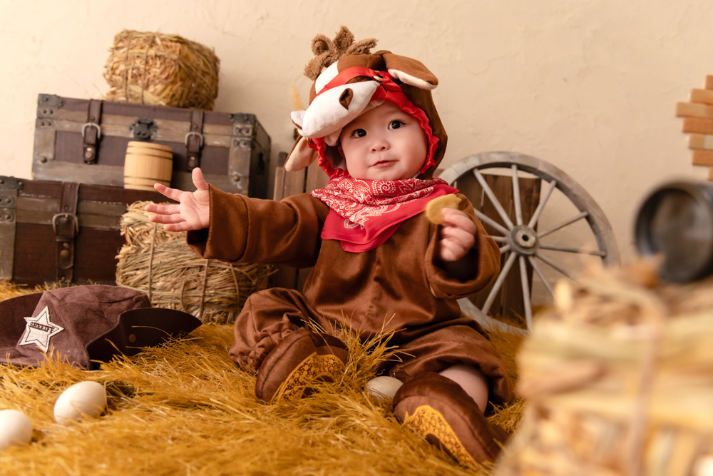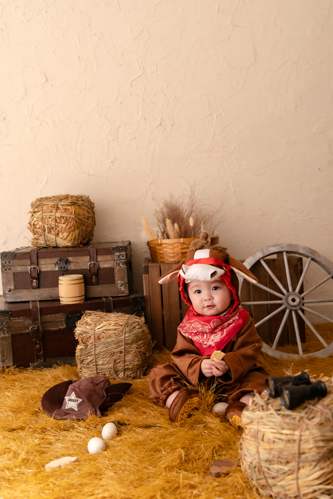 背景の木製の車輪は、物事が円滑に回る象徴です。また、赤ちゃんの傍らに置かれたシェリフハットは、正義感とリーダーシップを象徴し、自分らしく人生をコントロールして進んでいけますように願いを込めました。