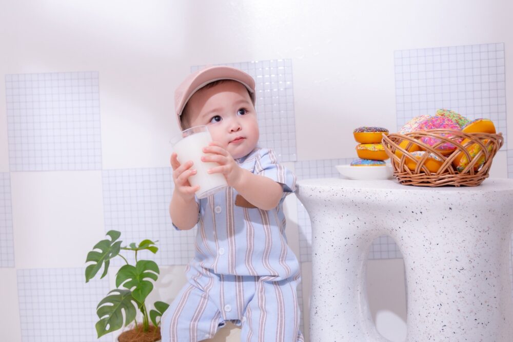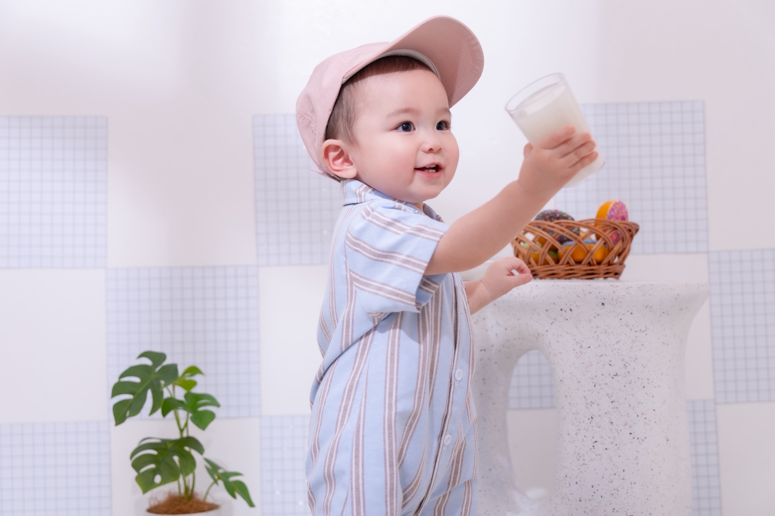 例えば、こちらの一枚。 手にしたミルクを不思議そうに見つめる表情。作り込まれた笑顔も素敵ですが、こうした「何かに夢中になっている瞬間」こそ、その子らしさが一番あふれる時です。柔らかな光が差し込む背景が、赤ちゃんの透明感をより一層引き立てます。