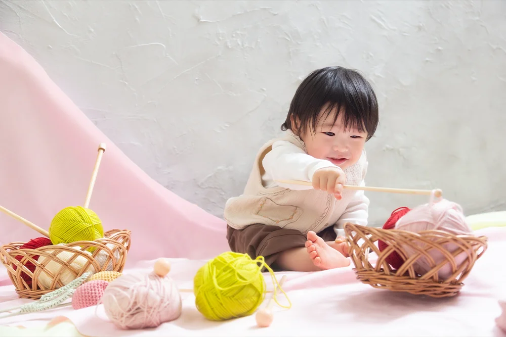 また、写真工房ぱれっとでは、思い出の品のお持ち込みも大歓迎です。 おじいちゃん・おばあちゃんから貰ったお洋服や、お気に入りのおもちゃと一緒に撮影することで、より「その子らしさ」が詰まった1枚になります。 旭川店の広いスタジオで、遊びながらリラックスした表情を引き出していきます。
