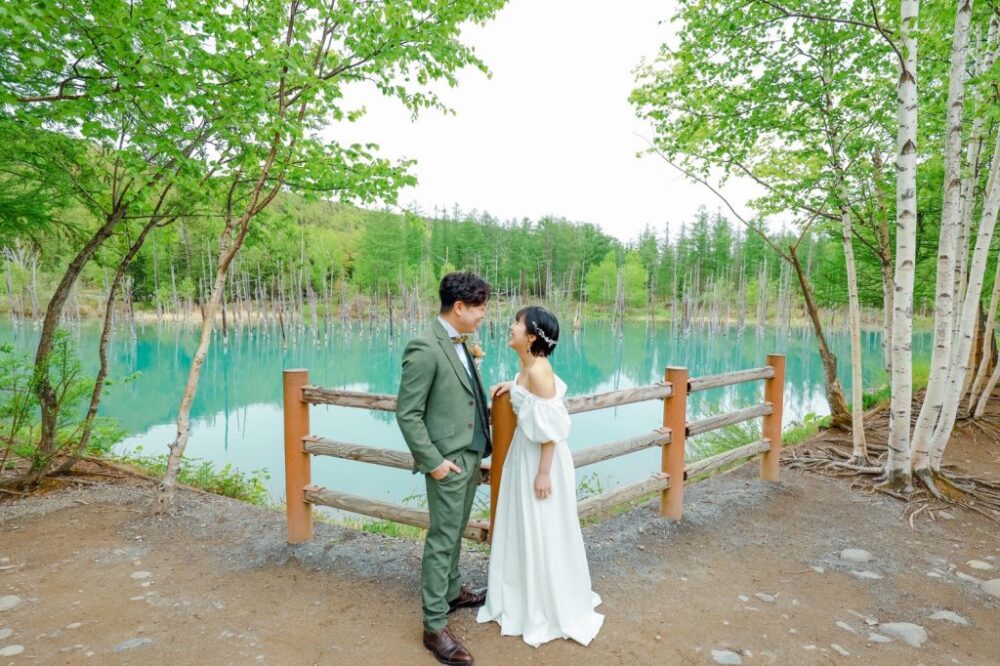 幻想的な青だけでなく、池に反射する山々や白樺が、お二人の幻想的な空間をより引き立ててくれること間違いなしです✨
