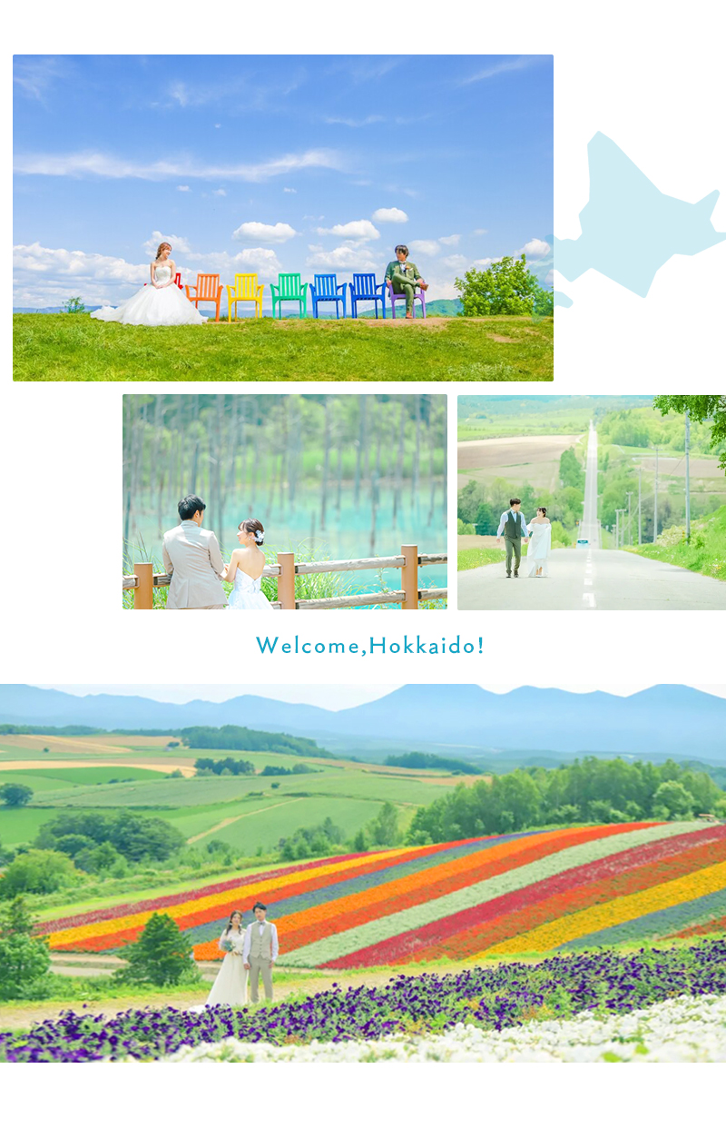 青い池、四季彩の丘、ジェットコースターの路など人気ロケ地2つで撮影することができます♪