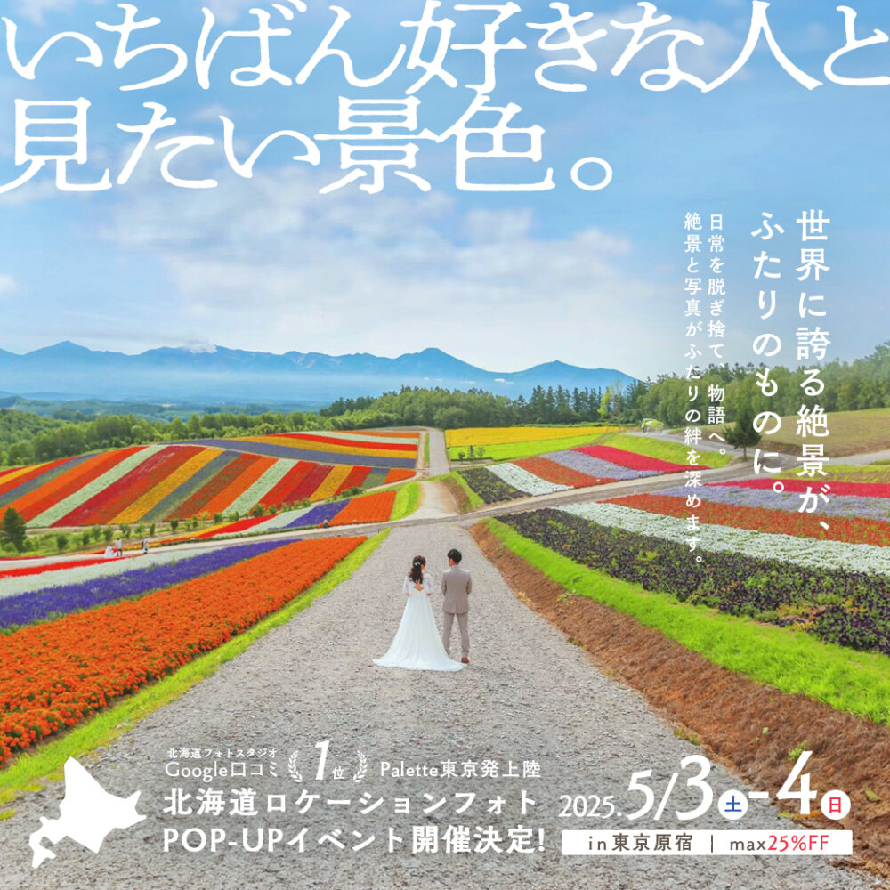 なんとこの度、北海道のフォトスタジオPaletteが東京初上陸!!! 北海道ロケーションフォトのPOP-UPを行うことが決定いたしました˚✧₊ 世界に誇れる、富良野・美瑛でのロケーションウェディングフォトを関東エリアでご相談・ご契約をいただくことができます!