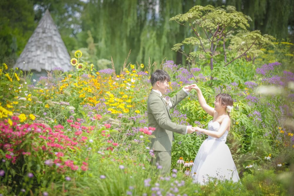 フラワーランド: 様々な種類の花が咲き誇り、色彩豊かな背景での撮影が楽しめます。特に花好きのカップルにはたまらないロケーションです。