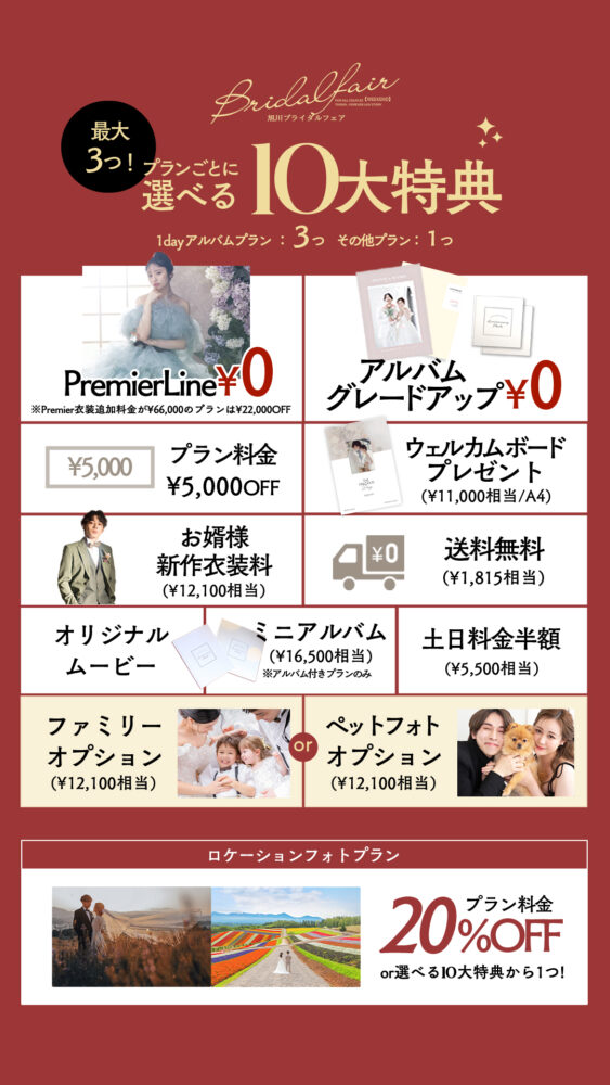 【写真工房ぱれっと旭川店】前回のブライダルフェアでも反響の大きかった10大特典!! 特に人気の高いオプションから今回のフェアに限りなんと最大3つまでプレゼント♡