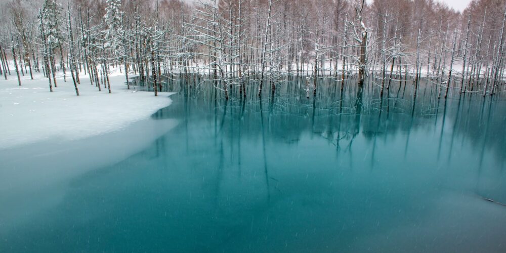青い池は、立ち枯れたカラマツとコバルトブルーの湖面が冬の静けさの中で