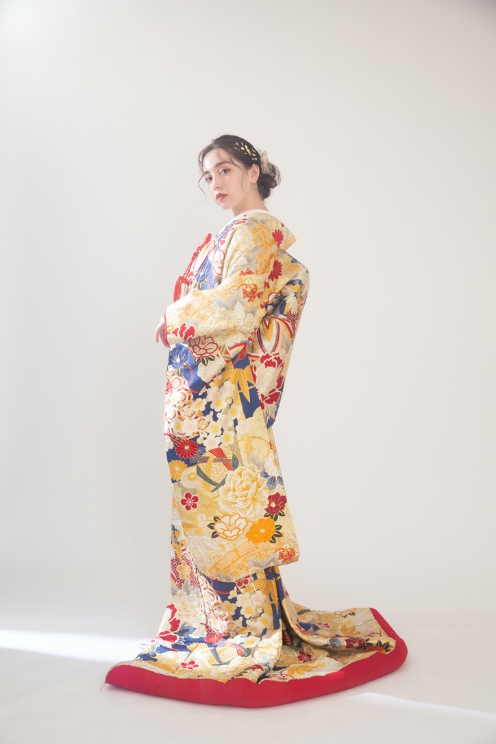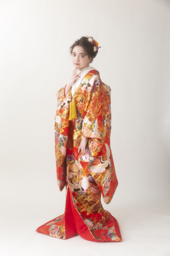 たとえば、お花の色味とは対照的な「赤」や「金」が基調の豪華な色打掛はいかがでしょう?