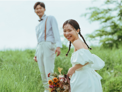 スタジオ撮影とは一味違う、開放感あふれるロケーション撮影。上野ファームの心地よい風を感じながらの撮影は、緊張しがちな新郎新婦さまの心を解きほぐし、いつものおふたりのような自然な笑顔を引き出してくれます。