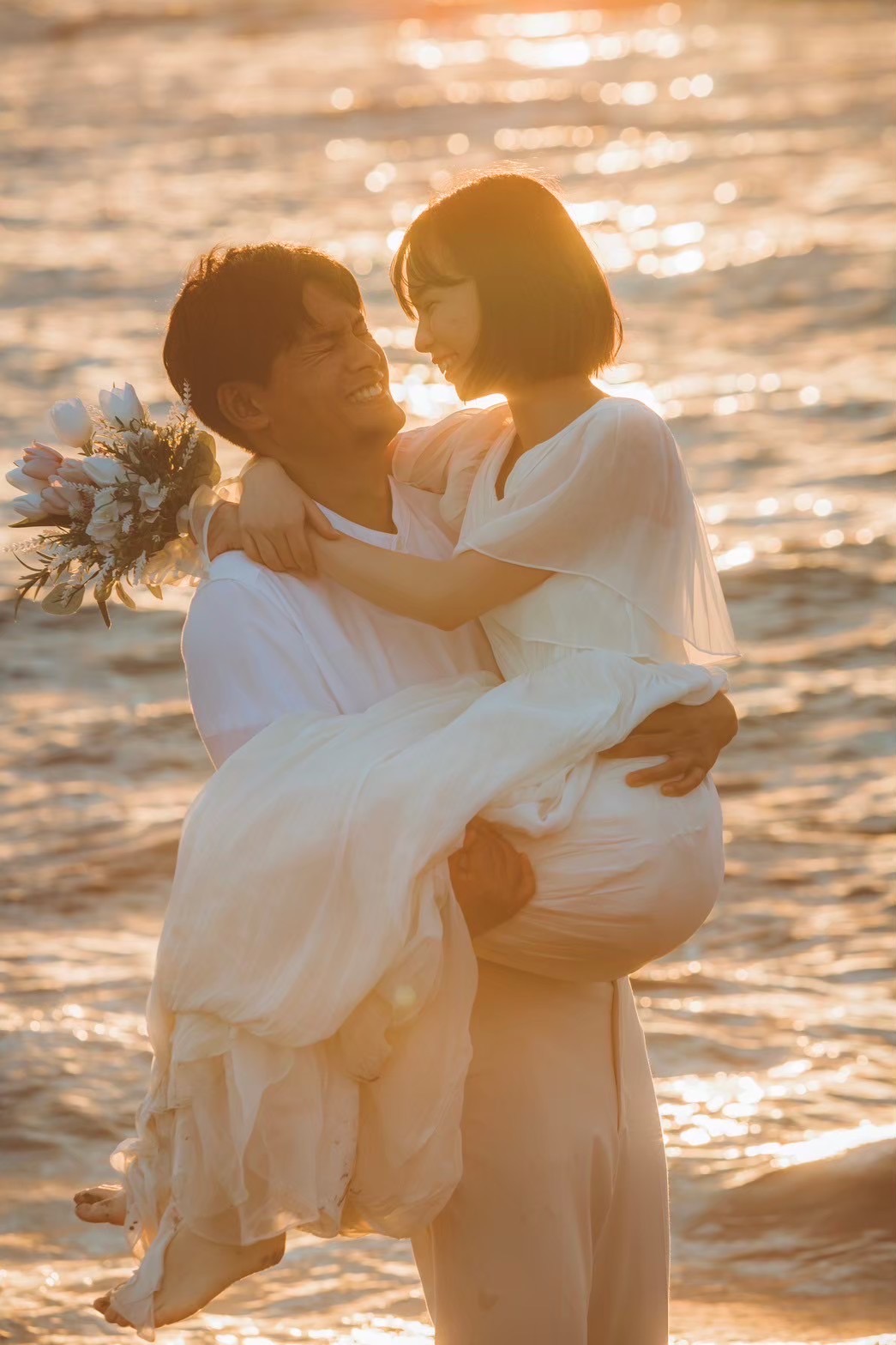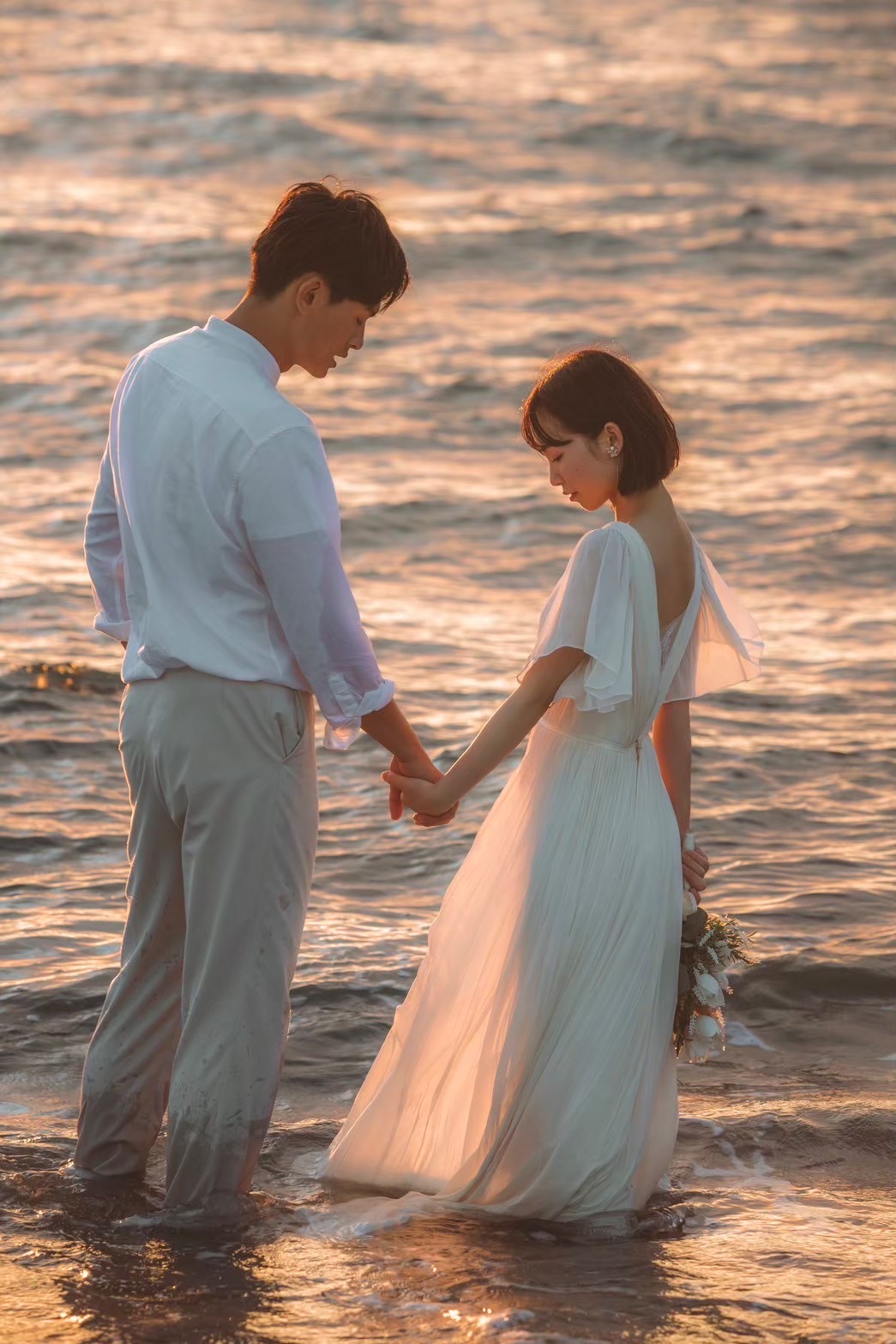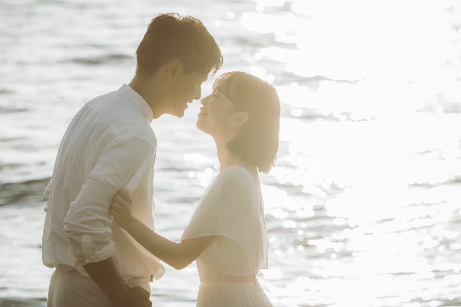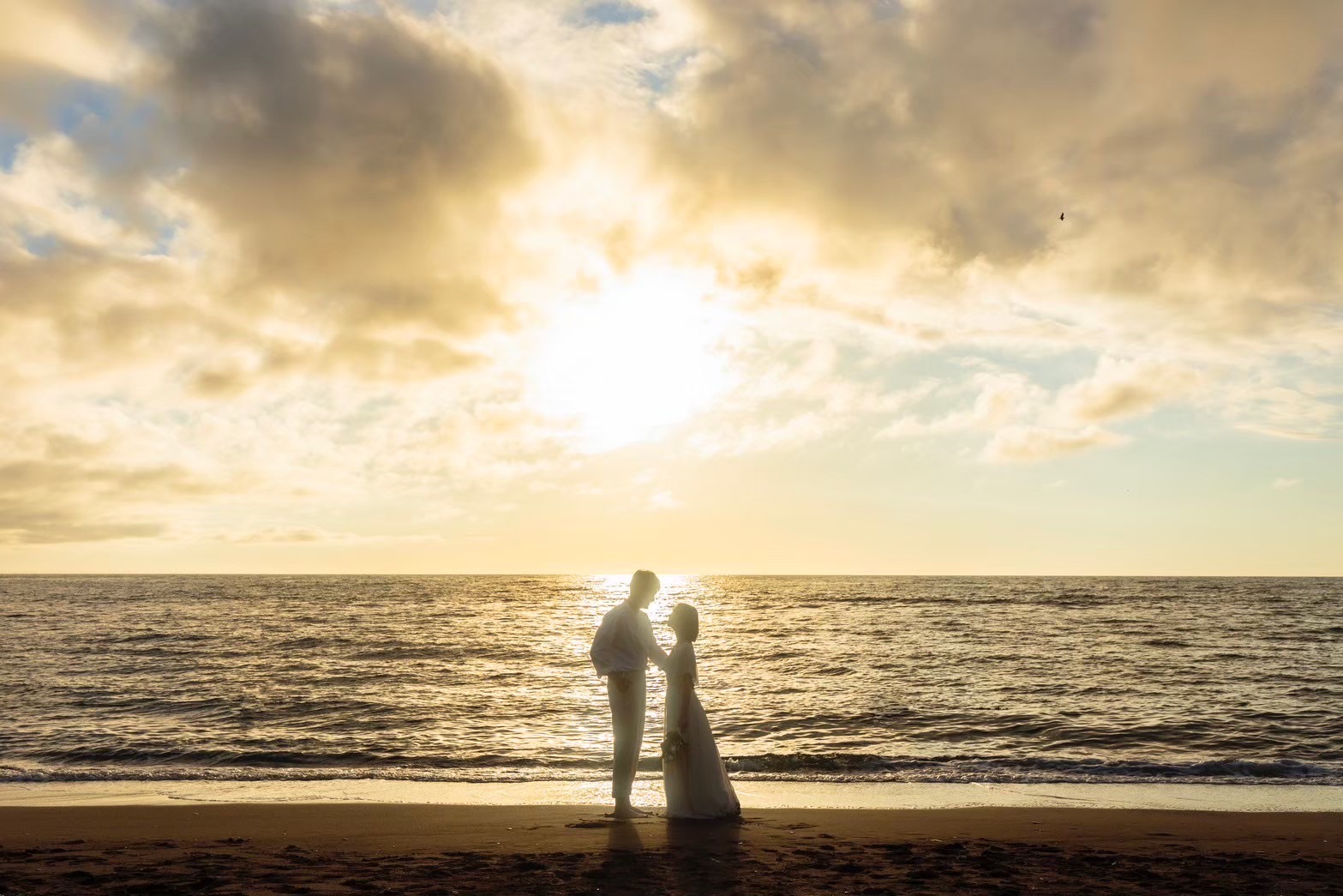 太陽が沈み始める時間帯、海面が黄金色に染まる「ゴールデンビーチ」は、言葉を失うほどの美しさです。柔らかい光がお二人を包み込み、肌を綺麗に見せてくれるだけでなく、シルエットを強調したドラマチックな一枚も残せます。