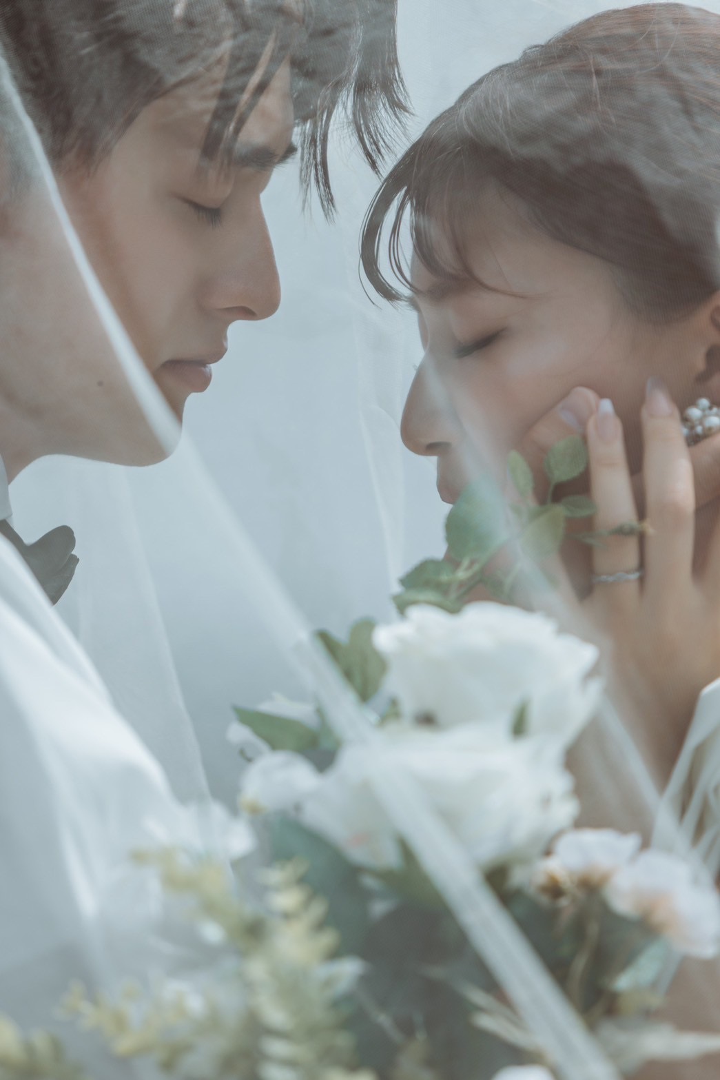 表情が見えない分、見つめ合うお二人の空気感や、ドレスのライン、ブーケの形が際立ち、まるで映画のワンシーンのような仕上がりです。