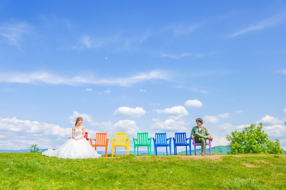 旭川近郊のロケーション撮影最大の魅力は、なんといっても色彩の鮮やかさです。太陽の光をたっぷり浴びた芝生のグリーンや、突き抜けるような青空は、おふたりの笑顔をよりいっそう輝かせてくれます。美瑛や富良野へもアクセスしやすい旭川店だからこそ、まるで映画のワンシーンのような広大な景色での撮影が叶います。
