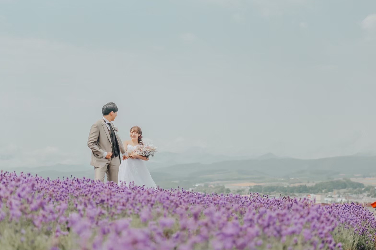 夏にしか撮れないお写真といえば、季節のお花とのカットですよね。特に北海道の夏を象徴する「ラベンダー」に囲まれた撮影は、この時期だけの特権です。一面に広がる紫色の絨毯と、太陽に照らされてキラキラ輝く光の重なりは、息をのむほど幻想的。ラベンダーの優しい色味に合わせて、淡い色の小物やナチュラルなヘアアレンジを楽しむのもとってもおしゃれです。