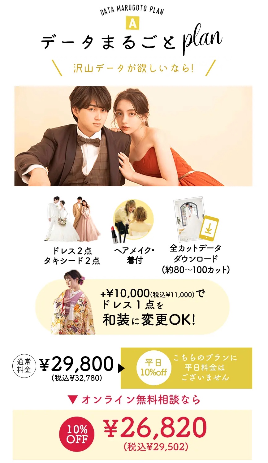 今月限定の新プランはどのお衣装を着ていただいてもお衣装の追加料金はなし!