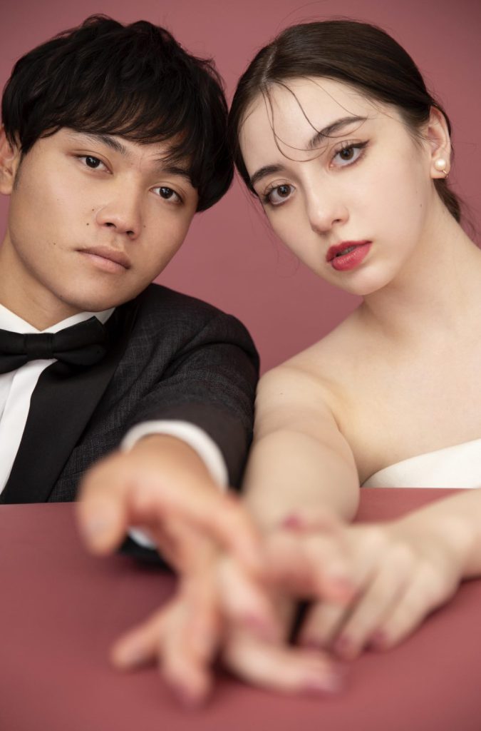 新作のブラックドレス×黒タキシードでとことんシックに。