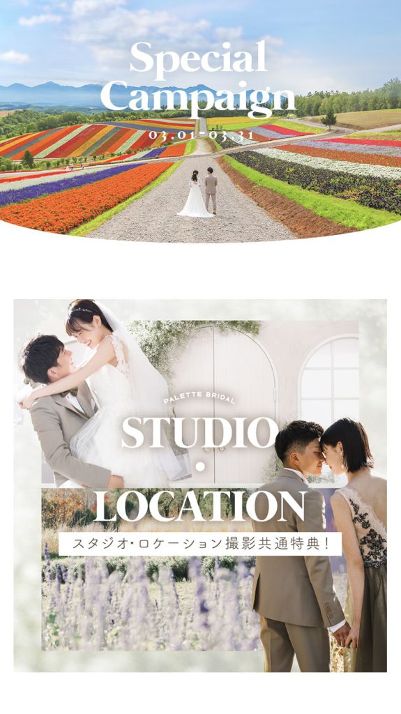 写真工房ぱれっと旭川店では5〜6月に結婚式を迎えるプレ花嫁様にも安心な即日データお渡しができるフォトスタジオです!3月の撮影の空きも残りわずかとなりました!まだお写真撮ってないお二人は旭川店にお越しくださいませ!3月18日から特別なキャンペーンも開催いたします.*この機会をぜひお見逃しなく!