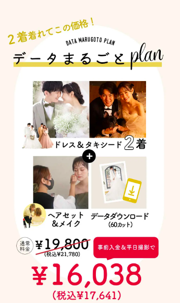 お嫁様、お婿様お衣装2着で撮影ができるデータまるごとプランです。