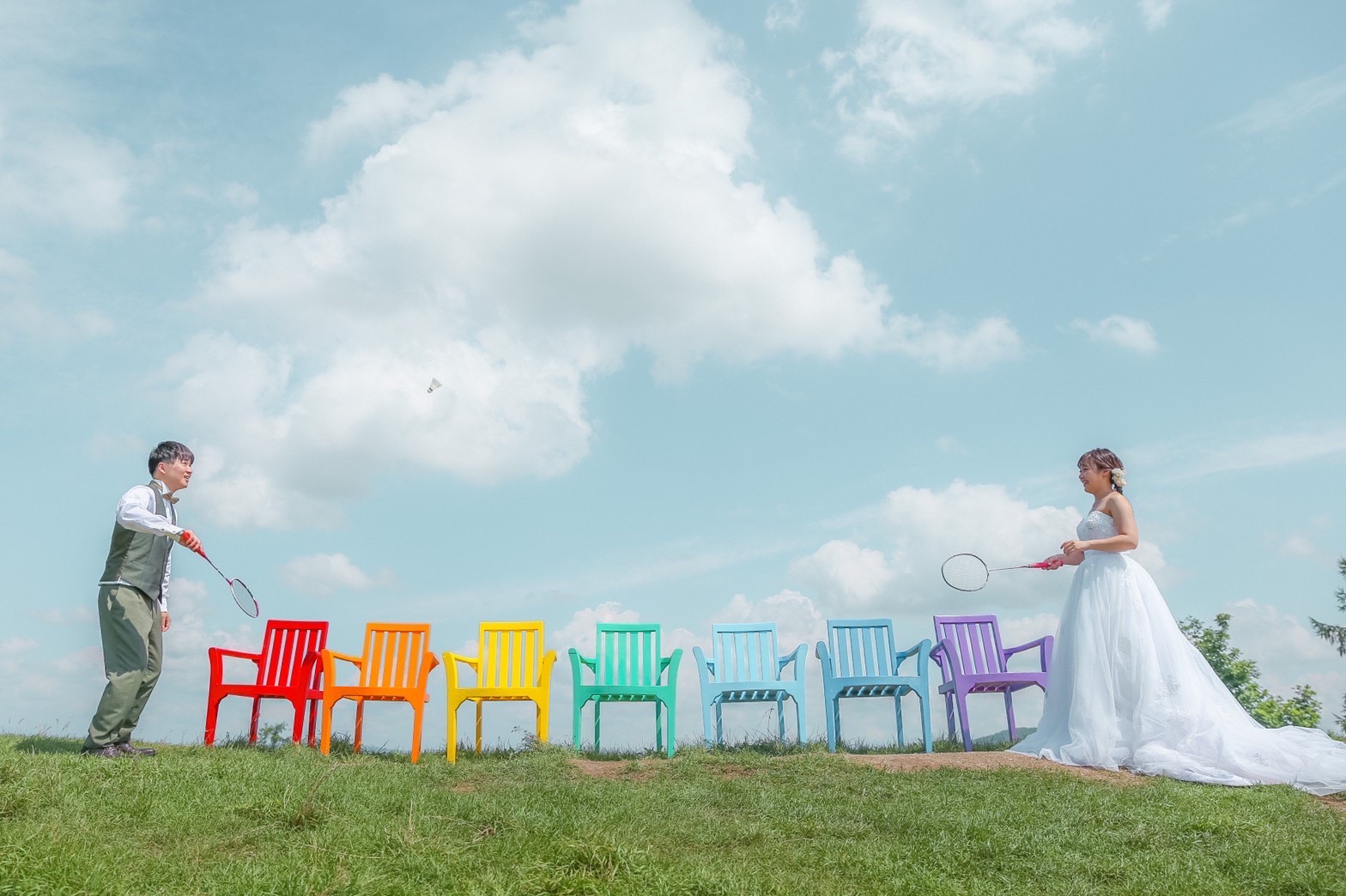 七色のイスの前で空をバックに、実際にバドミントンをしていただきました!