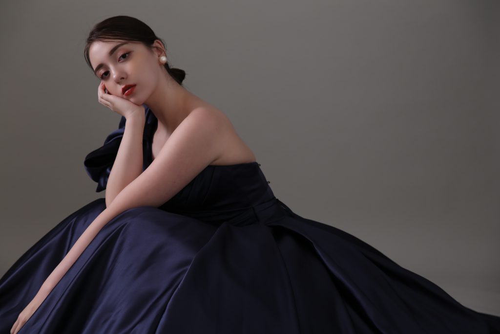 深みのあるネイビーに肩周りがリボンの形になったワンショルダーのデザイン。