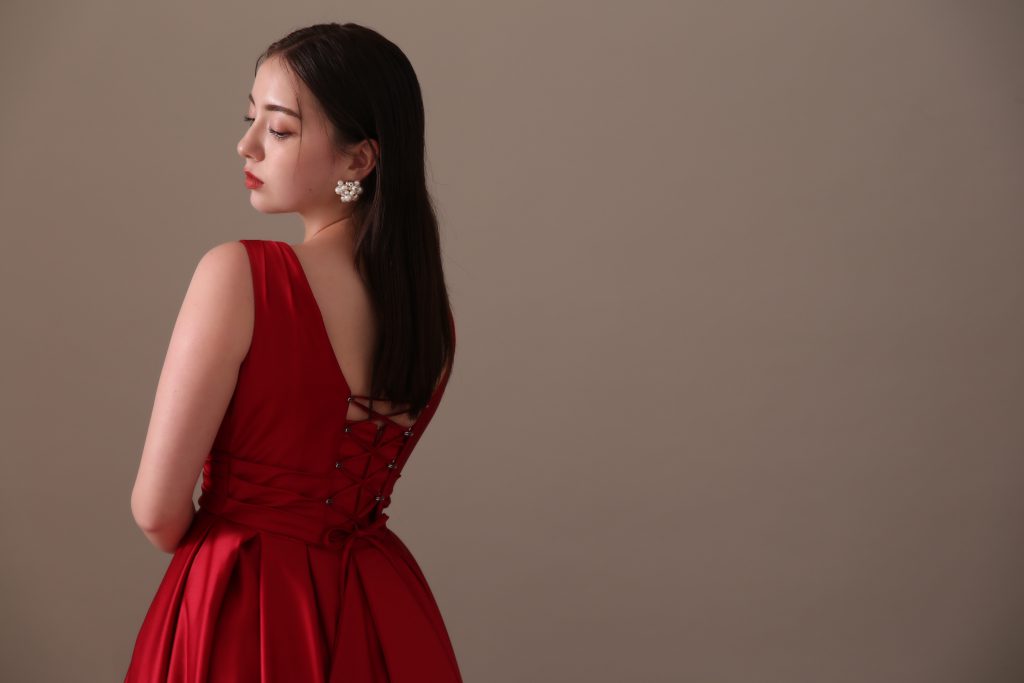 だいたんにあいた背中と胸元のVラインが気品さのある1着
