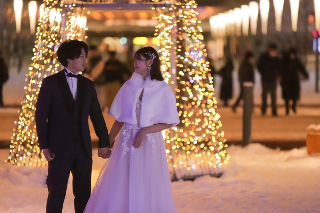 お昼の旭川駅と違って夜はライトアップされているのでロマンチックですよね*・゜