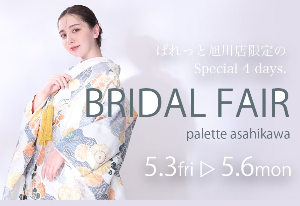 北海道旭川市にある写真工房ぱれっと旭川店です! GWも残り2日となりました!当店ではブライダルフェアを開催中!12100円相当の期間限定特典もご用意しておりますのでぜひこの機会にご来店くださいませ♡ ブライダルフェアはオンライン相談でも可能です!みなさまのご予約をお待ちしております♪