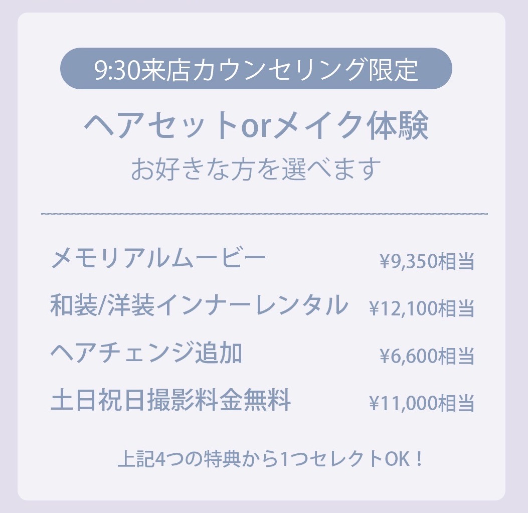 メモリアルムービーやインナーレンタル、ヘアチェンジなどあったあらいいな♡というオプションが入っているので