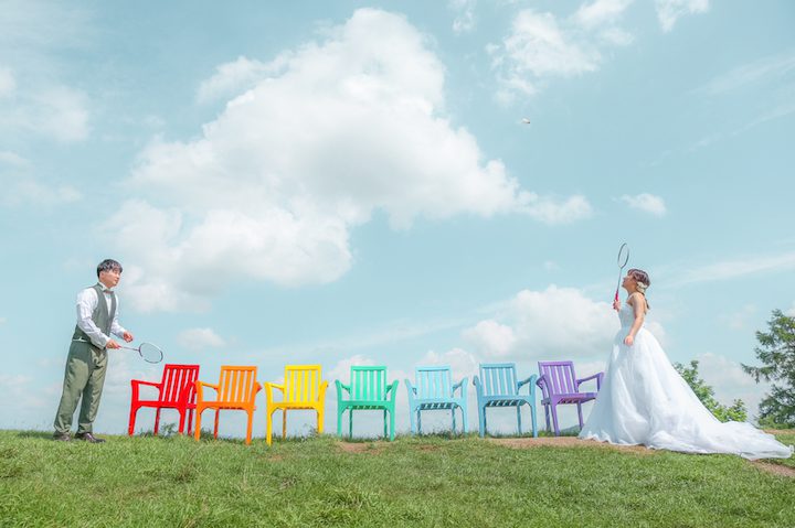 カラフルなベンチで一休みしてみたり、今回のお二人はお持ち込みの小物で