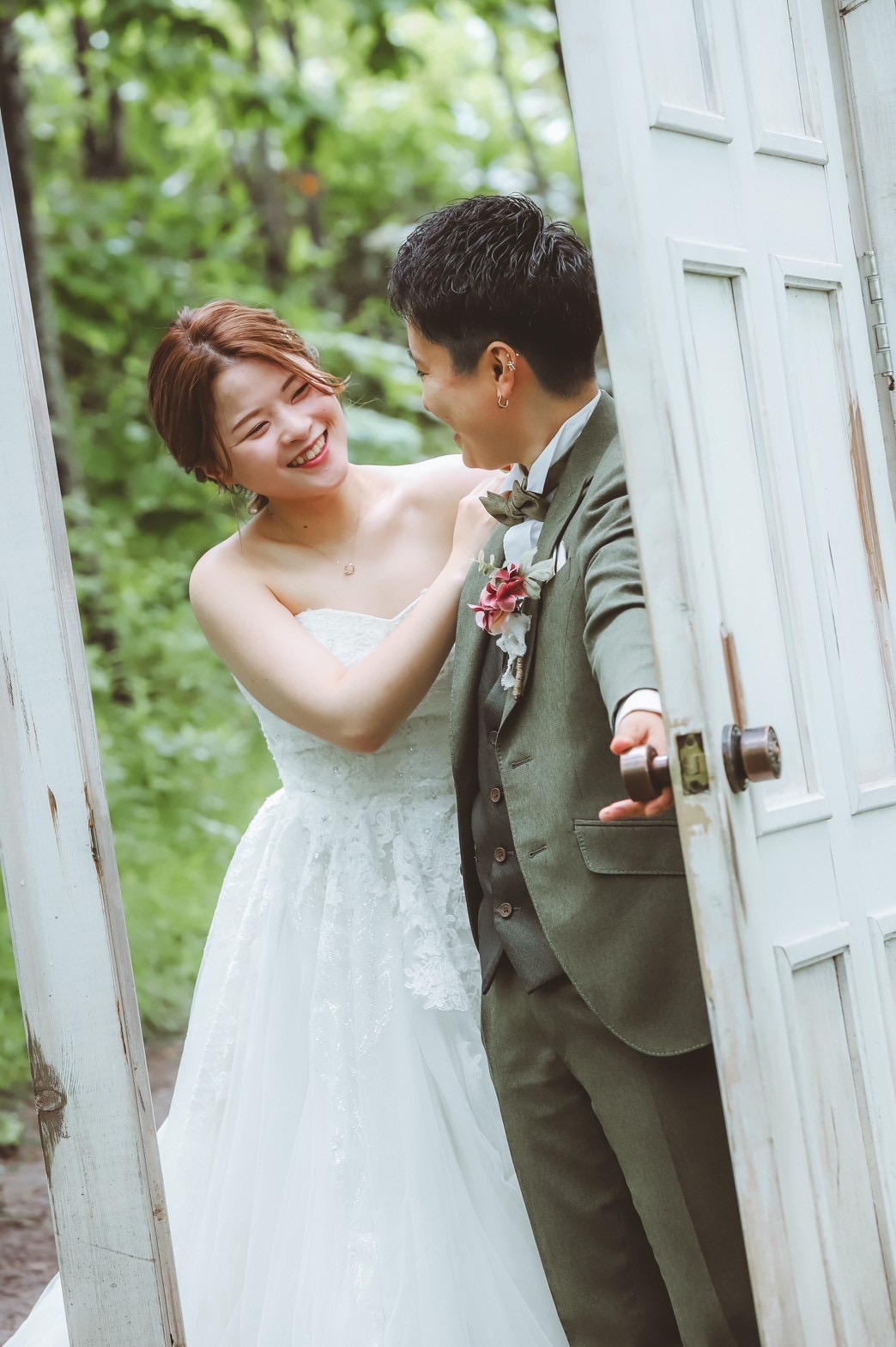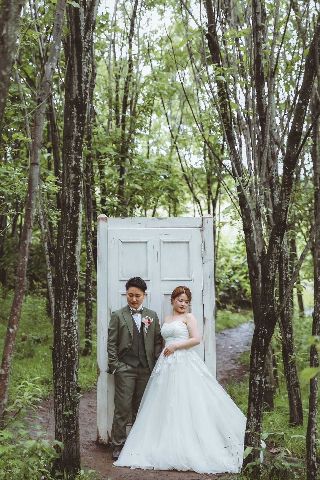 扉の前で周りの森林の雰囲気と合わせてかっこよく、シックなポーズで撮影し普段のお二人の楽しい