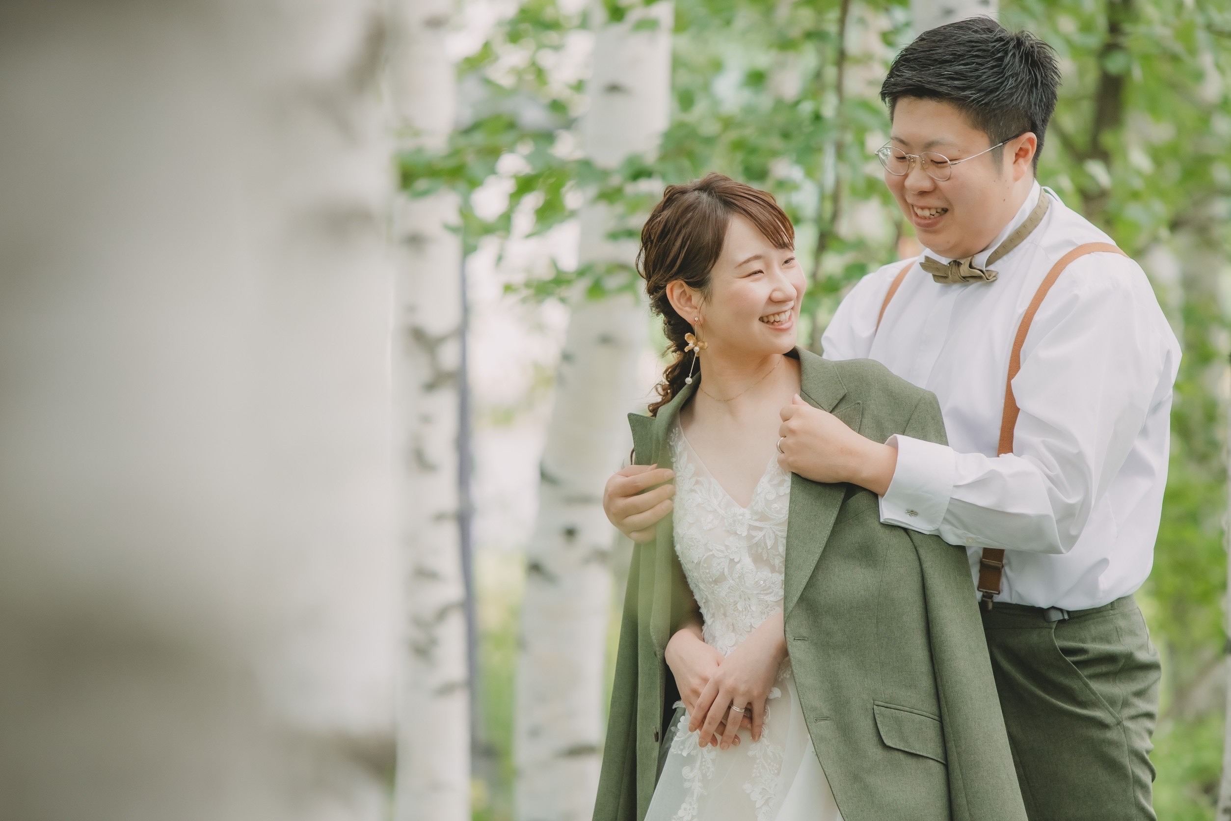 こちらのお写真は雨を感じさせないお二人の楽しい雰囲気と雨で少し寒かったのを活かしてお婿さんのジャケットをかけてあげるというお婿さんの優しさが詰まったお写真になっています♡